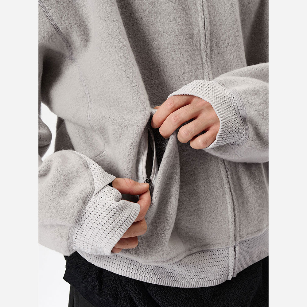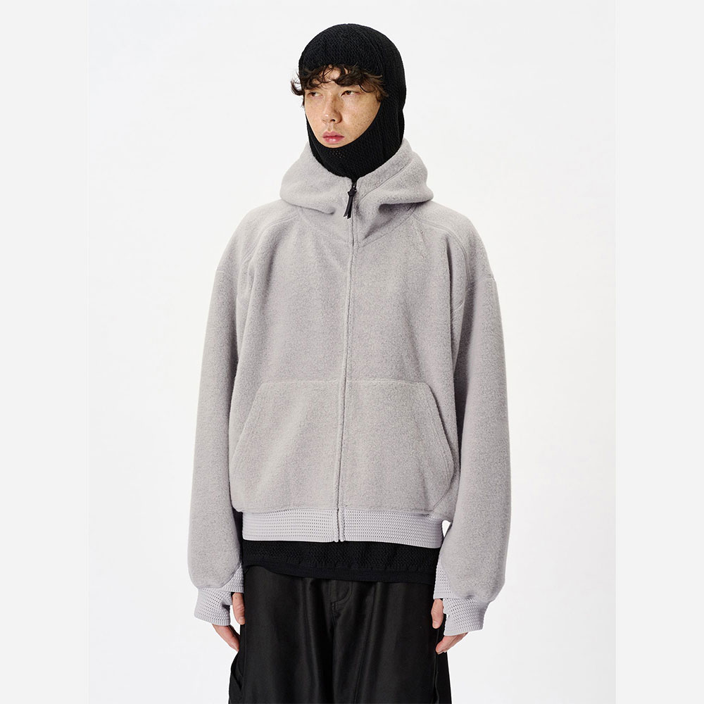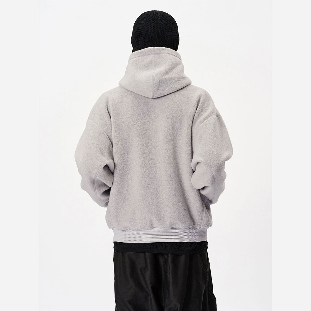 あたたかみがあり、柔らかなウールフリースを使用したリラックスフィットのフーディ。独特な起毛感のある生地と際立った切り替えのラインが特徴で、特殊なメッシュ編みのリブを袖と裾に使用しています。