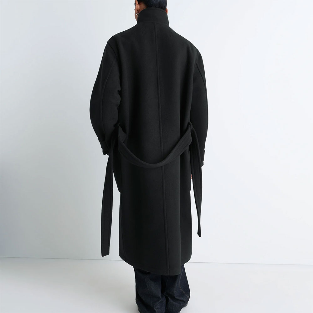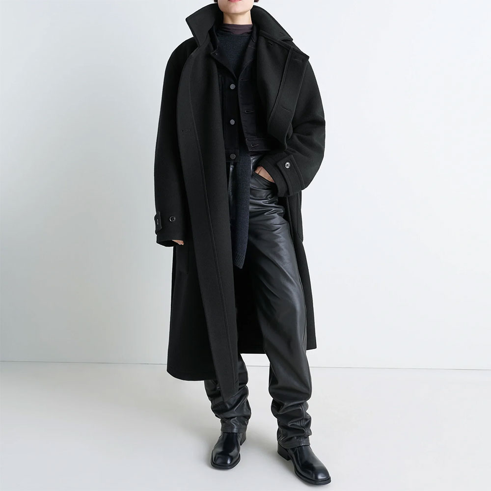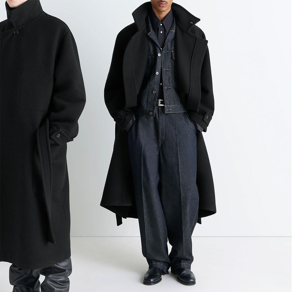 柔らかく防寒性も高い両面ウール。ルメールらしいシングルボタンで閉じられるハイカラー、アシンメトリーなボタンフロント。シルエットに丸みを与えたドロップショルダーのオーバーサイズフィット。内側に胸ポケット、パッチポケット2つ、取り外し可能なベルト付き。