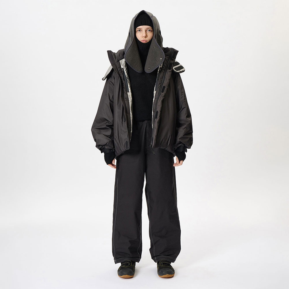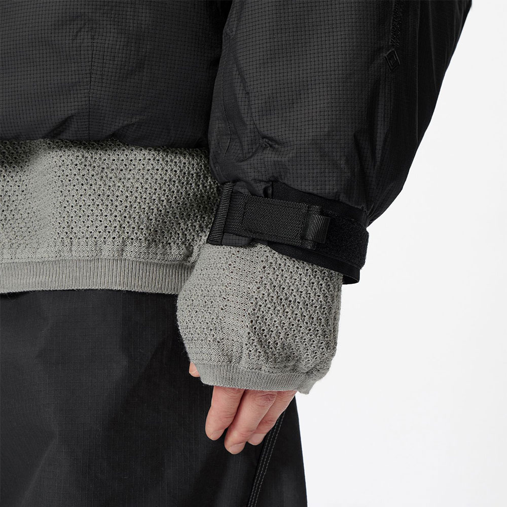 高機能素材をオーバーサイズの特徴的なコクーン型のシルエットで仕立てた軽量中わたアウター。WINDSTOPPER by GORE-TEX LABS 2層ラミネートの中で最軽量のリップストップ生地でPrimaLoftの中わたを包んでいます。内部はチタンスパッタリング加工を施し、輻射熱を発しやすくなる特性をもつ生地を一部に使用しています。背中には取り外し可能なインサレーテッドパックを設置。暖かさやボリュームを変化させて着用できます。フードも取り外し可能です。