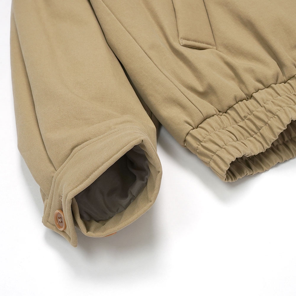 ニドム加工による柔らかな風合いのコットンギャバジンを使用した、中綿入りのブルゾン。裾のギャザーにより丸みのあるシルエットに。チンストラップ付きでスタンドカラー仕様での着用も可能。