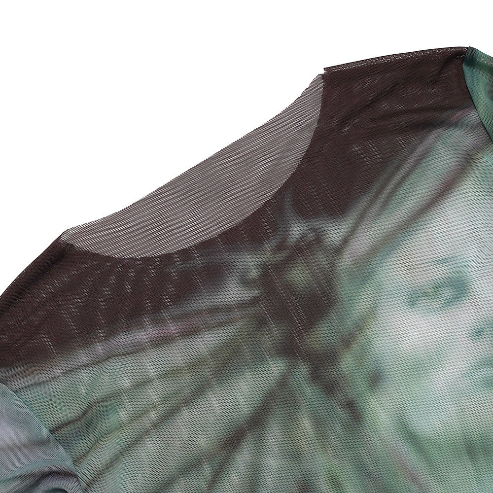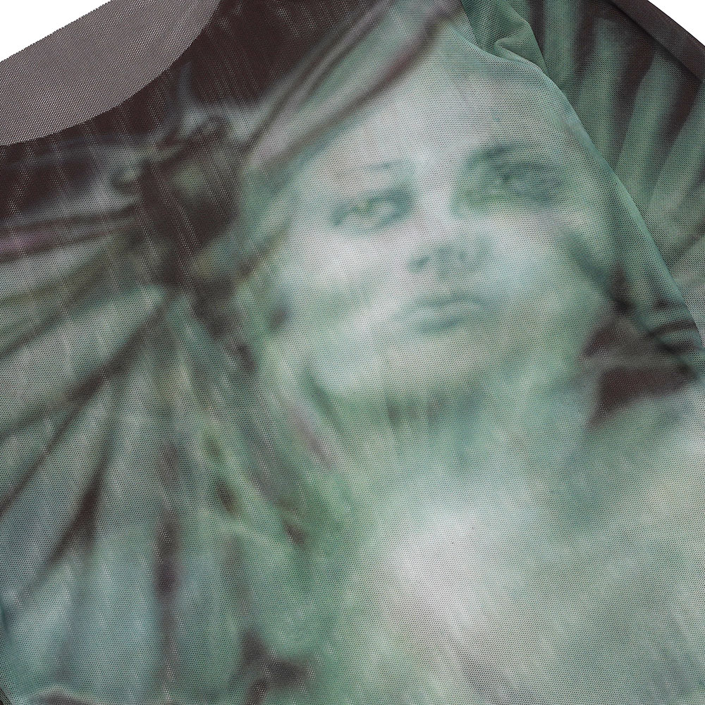 メッシュ素材のシアートップス。フロントとバックに施されたエアブラシのアートワークプリントが目を引く一枚。