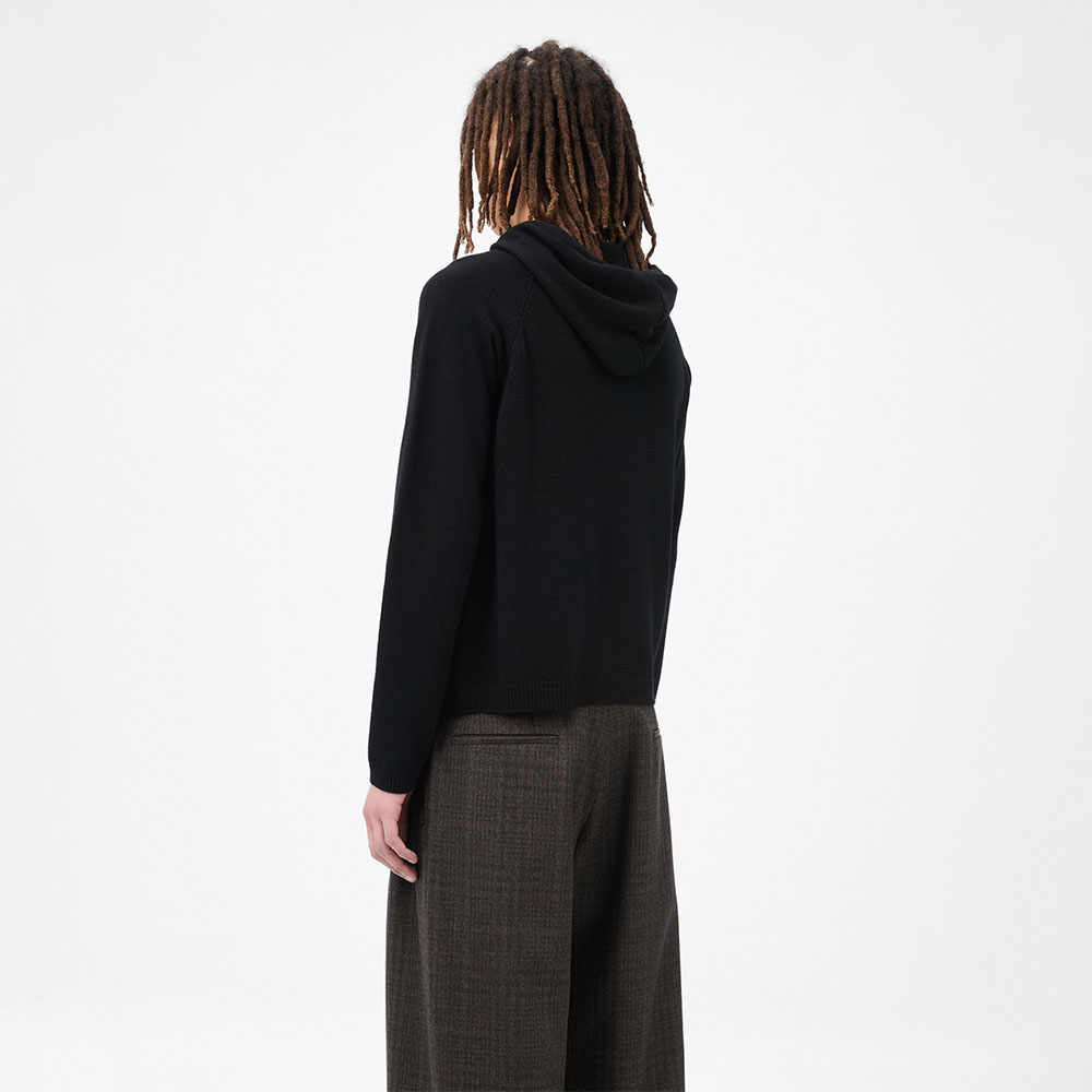 イタリア産メリノウール糸を使用し、リブ編み構造で製造されたニットフーディー。ゆったりとしたボックスシルエットが特徴。フード、ラグランスリーブ、パッチポケット、リブ編みの袖口と裾を備えています。