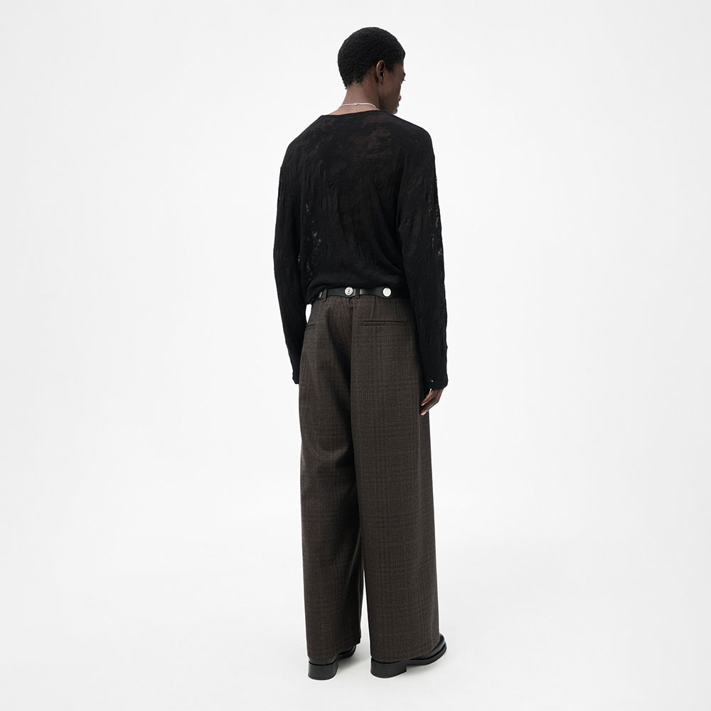 イタリア製バージンウール生地を使用したBRIDGE CHINOは、ワイドレッグのリラックスフィット。ダブルプリーツフロント、ボタン留め、YKKジップフライ、フロントウェルトポケット2つ、バックウェルトポケット2つ、シルエットを整えるダーツ仕様。ポンテショーツと同じ型紙を基に設計され、サイドシームレス構造でクリーンなシルエットを実現。