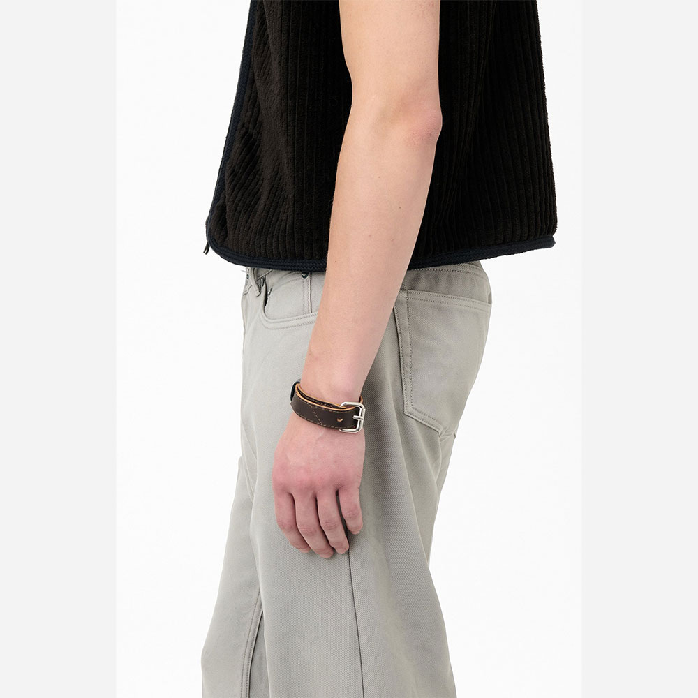 牛革製シガーブレスレット。植物タンニン鞣しのイタリアン牛革を使用し、柔らかな光沢とゴムのような風合いを特徴とします。手首に巻きつけたシガーを模したデザインで、重ね付けが可能。細長いストラップ端部は金属製ベルトループに差し込み、上部に端部が見える仕様です。
