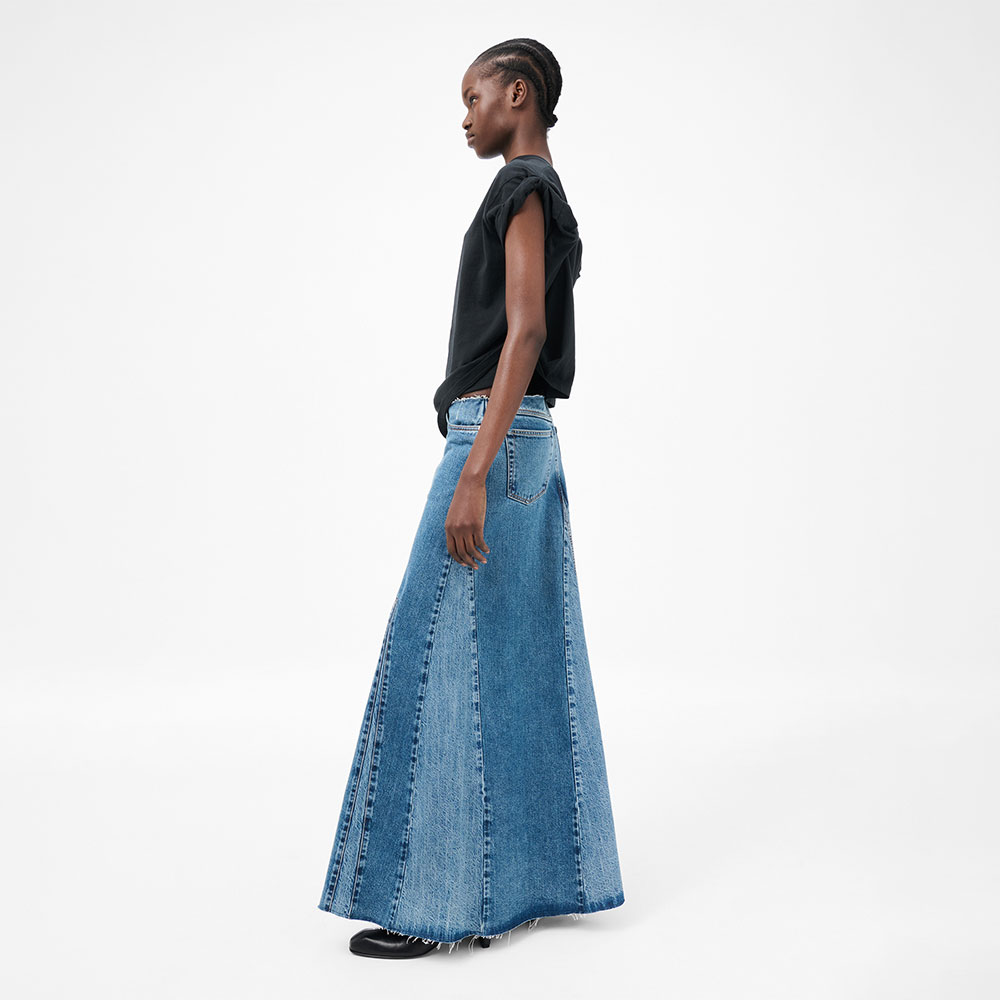 日本のデニム生地を使用したロングスカートになります。ゆったりとしたAラインシルエットが特徴。インディゴ染め、ヴィンテージ加工、手作業によるダメージ加工、パネル構造、フロントポケット2つ、生縁のウエストバンドと裾、フック&アイ留め、ジップフライを採用。ブロークンツイルデニムは、伝統的な斜めラインを断ち切ることで不規則なジグザグ構造を形成し、クラシックなツイル織りを再解釈。この特徴的なパターンは美観を高めるだけでなく、標準デニムにありがちなねじれを軽減する機能性も備えています。