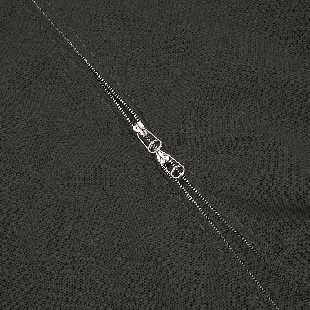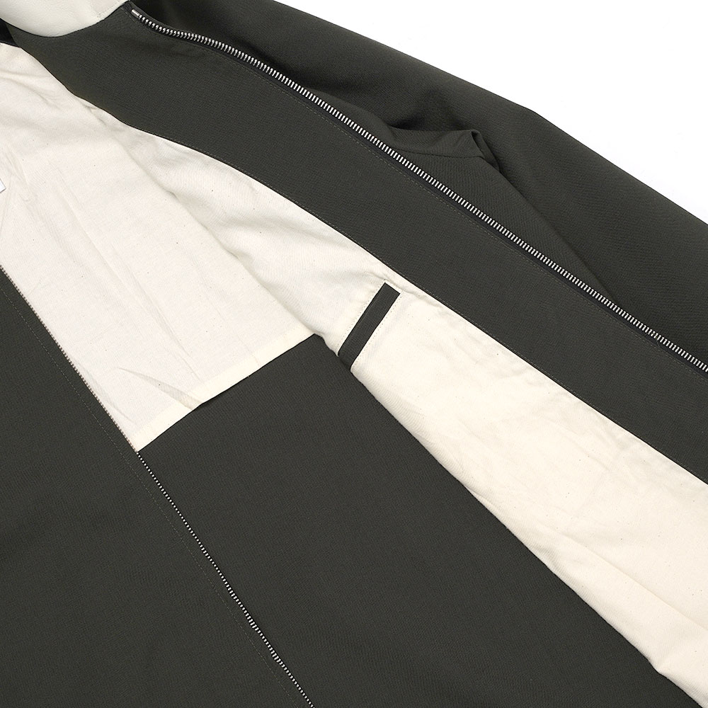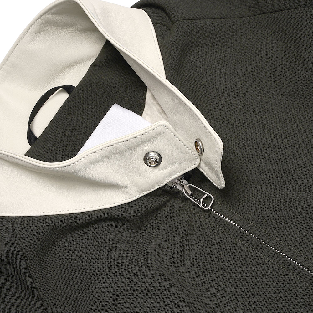 深みのあるダークグリーンに落ち着いたホワイトの襟元が映える、スイングトップ型ブルゾン。襟部分にはレザーを使用し、品のある佇まいに。内ポケット2つ、サイドポケット2つ。ダブルジップ仕様。