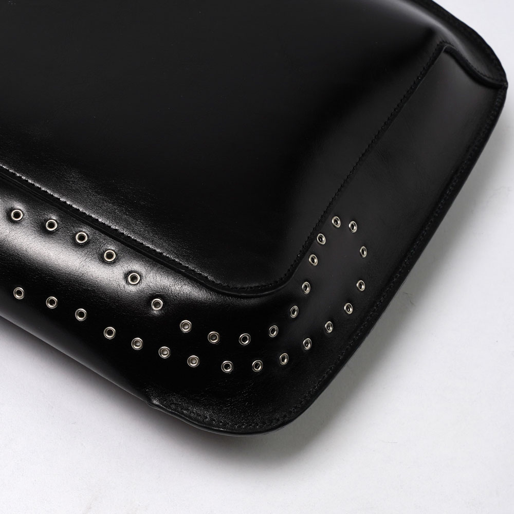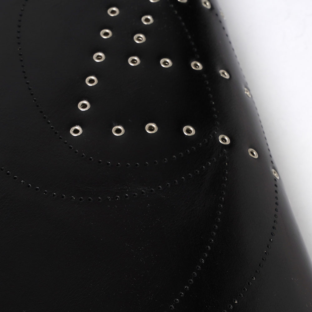 ハンドパーフォレーションによるグラフィックと、アイレットスタッズが立体的な表情を生み出します。