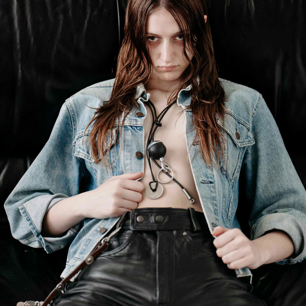 チューブ状のレザーコードに、ラバーボールとキーホルダーリングを組み合わせたデザインが特徴です。