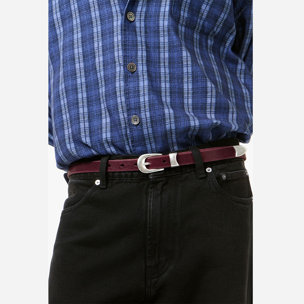 アワレガシーの定番モデルの2cm幅ベルト。ウエスタンベルトの装飾をそぎ落としたようなミニマルなデザイン。ユニセックスアイテム。