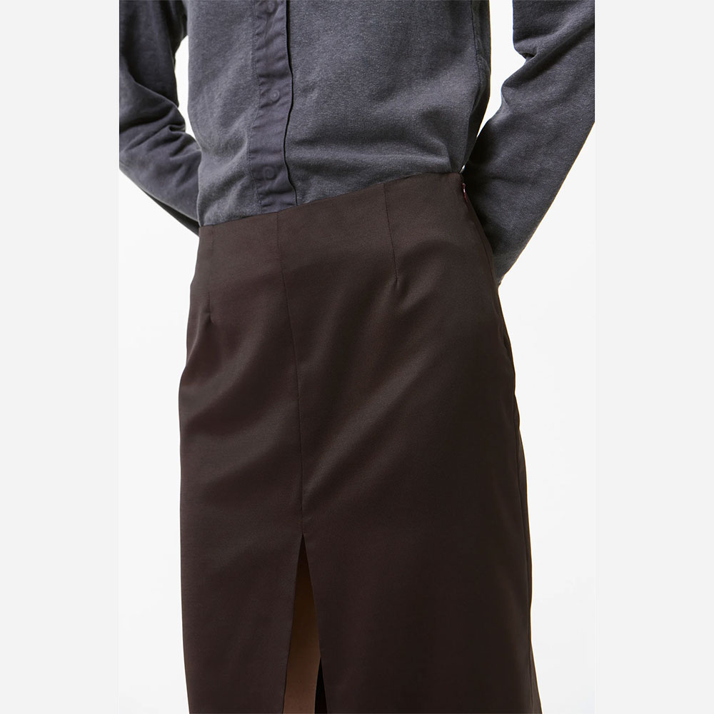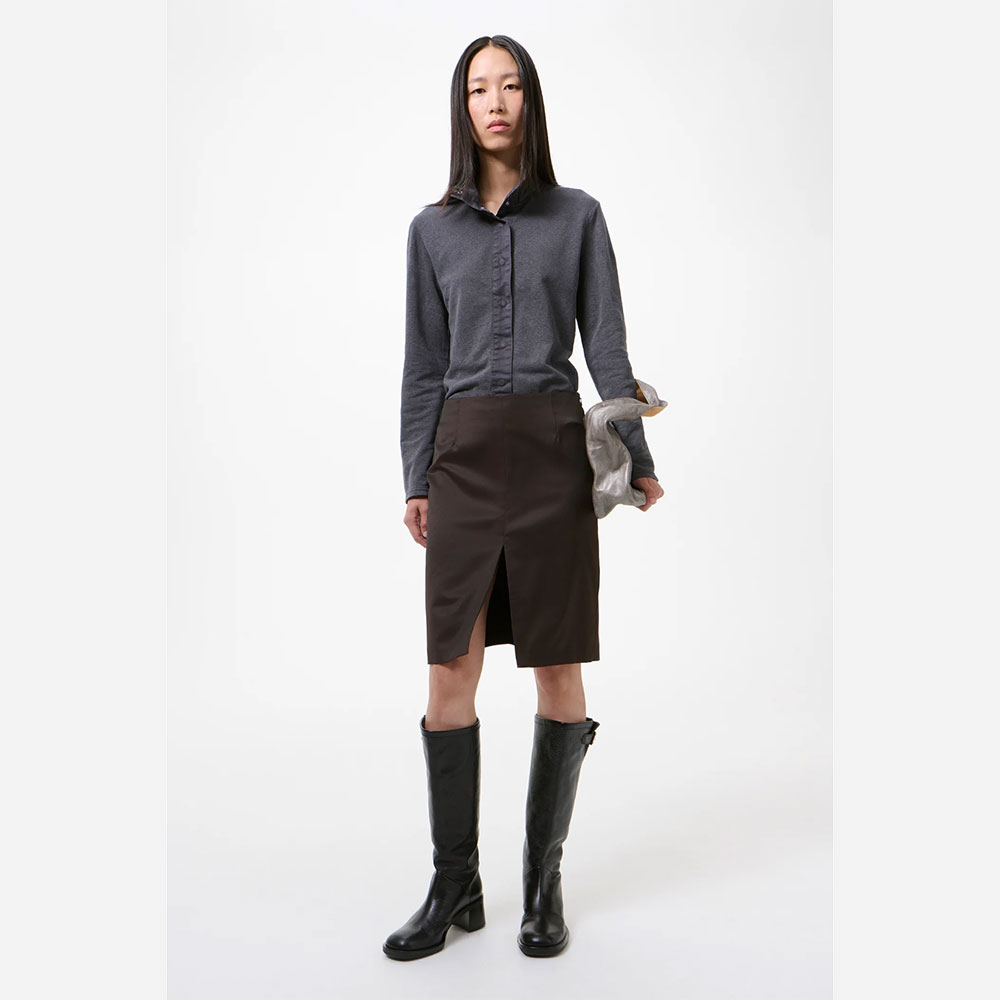 すっきりとしたペンシルシルエットに、フロント中央のスリットが上品なアクセントを添えています。