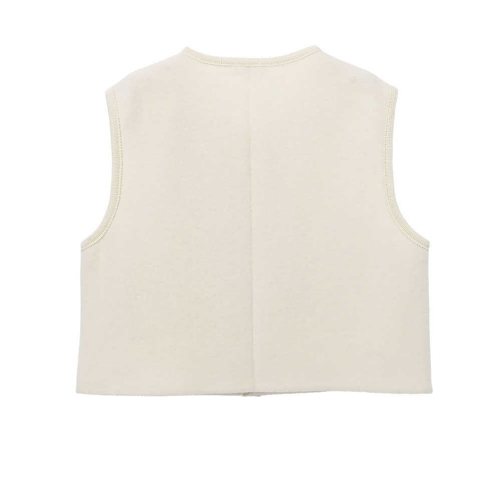 着丈は極端に短く、身幅は広め。胸部にポケットを配置。インナーとしても使いやすいジレタイプ。