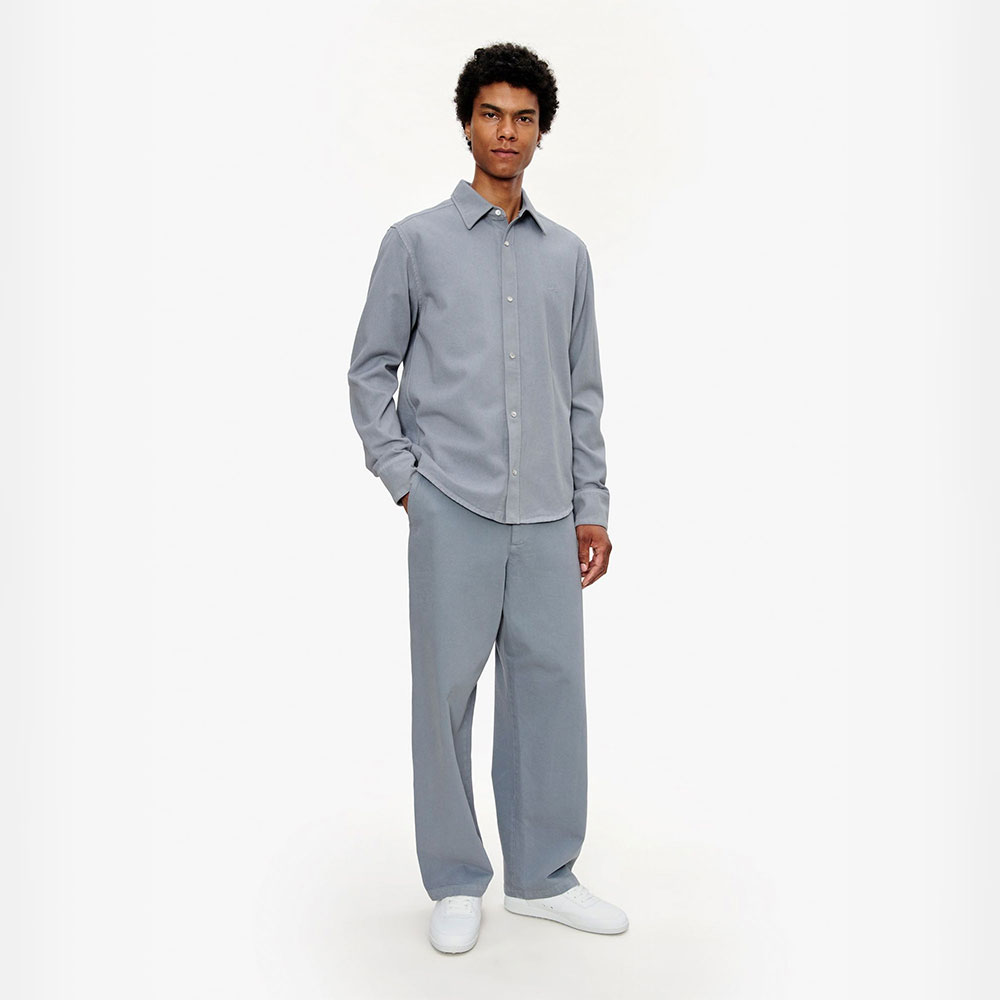 A.P.C.らしいクラシックな感性を体現した「Dan チノパンツ」は、コットン100%の柔らかな素材感に、程よくリラックスしたストレートシルエットとミドルウエスト設計を採用し、ブルーグレーの落ち着いた色味と“剣とギター”ボタンのさりげないディテールが、デイリーからフォーマルまで幅広いスタイリングに対応する一本です。
