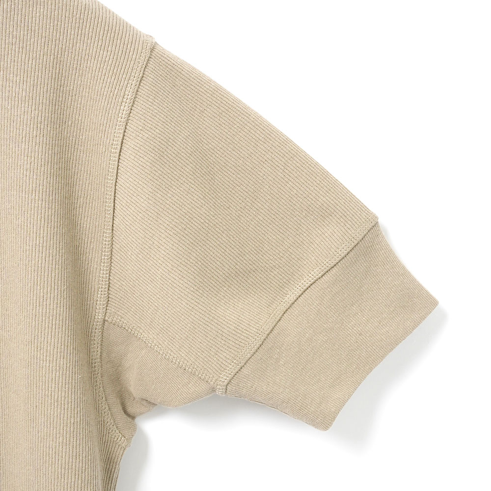ヘンリーネックの仕様と、やや長めにとられた袖口のリブが印象的で、シンプルながらもスタイリングのアクセントとなる一着です。