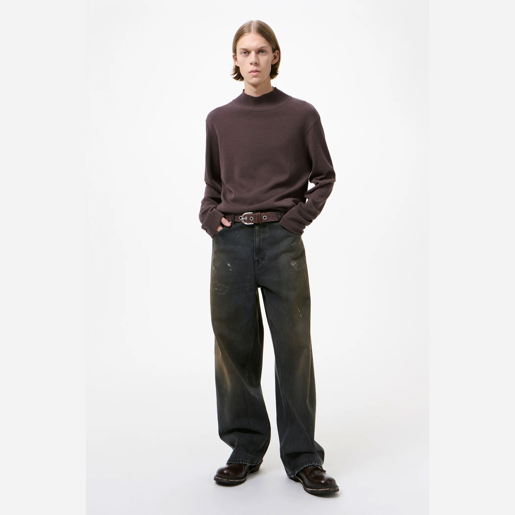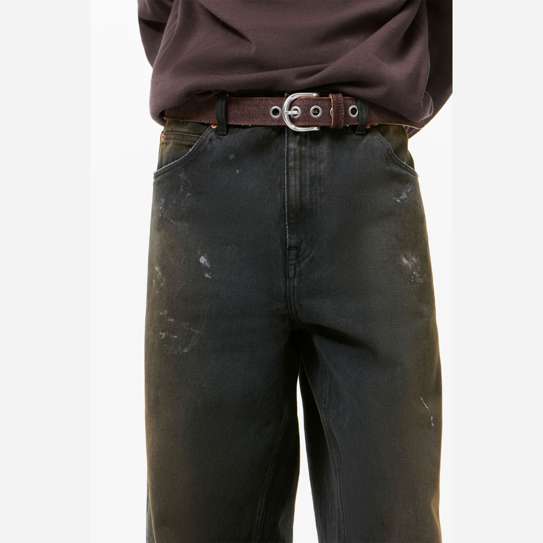 シルエットはハイウエストのワイドフィット。ゆとりを持たせた設計ながら、腰まわりはすっきりと収まるバランスに仕上げています。5ポケット仕様、スチールリベット、エンボス加工のOUR LEGACYパッチ、YKKジップフライを採用。