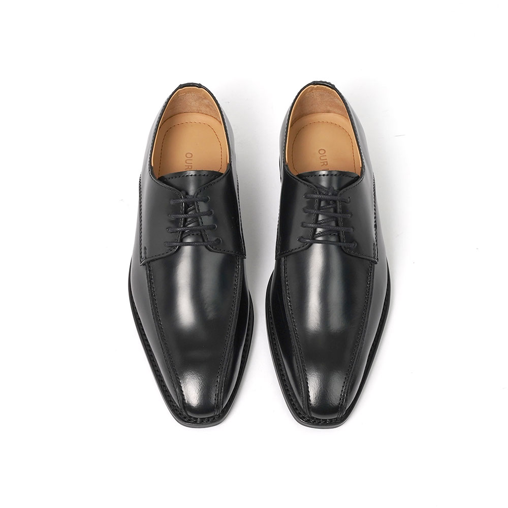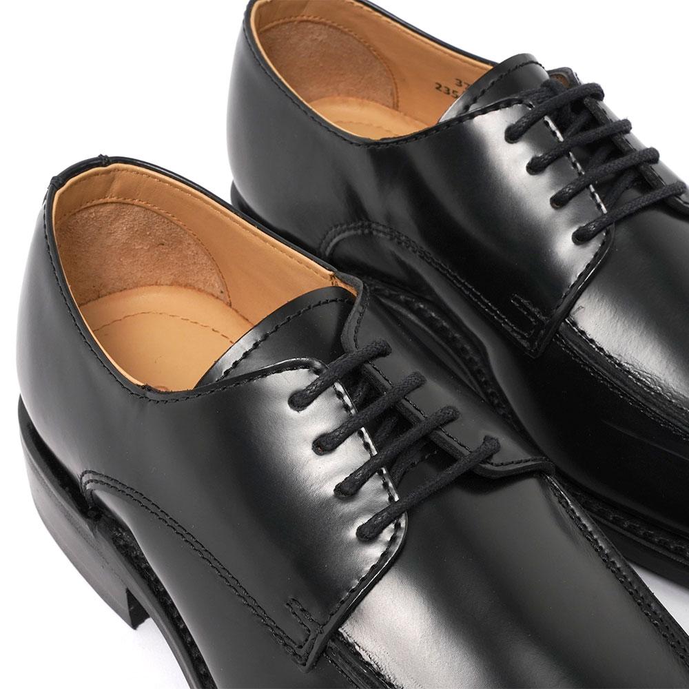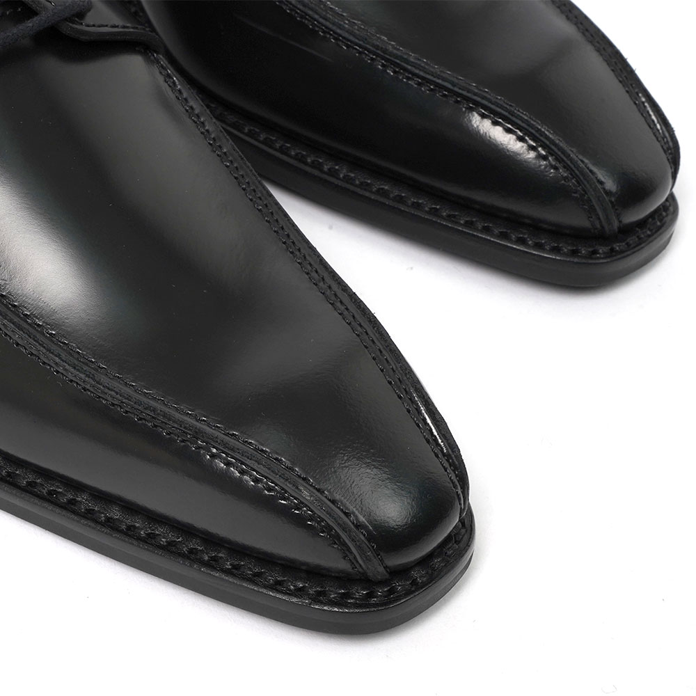 ポルトガル製のカウレザーにグレーズド加工を施したレザーシューズ。艶やかなブラックレザーが、洗練された存在感を放ちます。新たに設計されたラストを採用し、シャープさと程よい丸みを併せ持つポインテッドかつブランテッドなトゥシェイプが特徴。アッパーには外側に表出したシームディテールをあしらい、構築的な印象を強調しています。ソールにはグッドイヤーウェルト製法を採用。耐久性と安定感に優れ、履き込むほどに足に馴染む一足です。クラシックな佇まいの中に、ブランドならではのモダンなエッセンスを落とし込んだシューズとなっています。