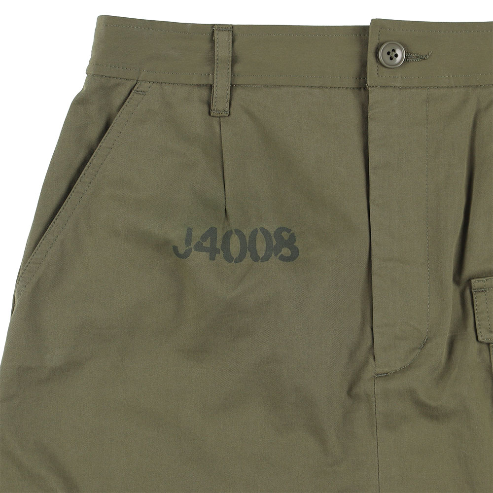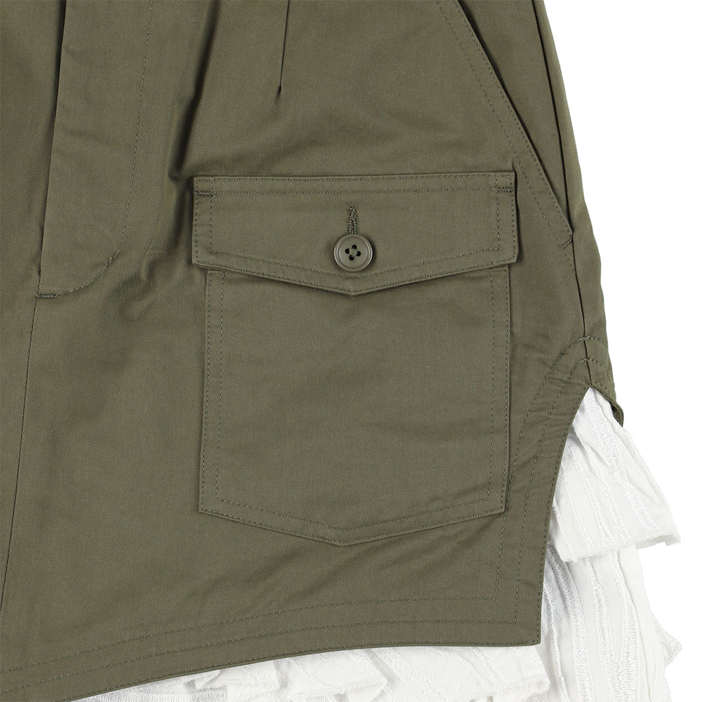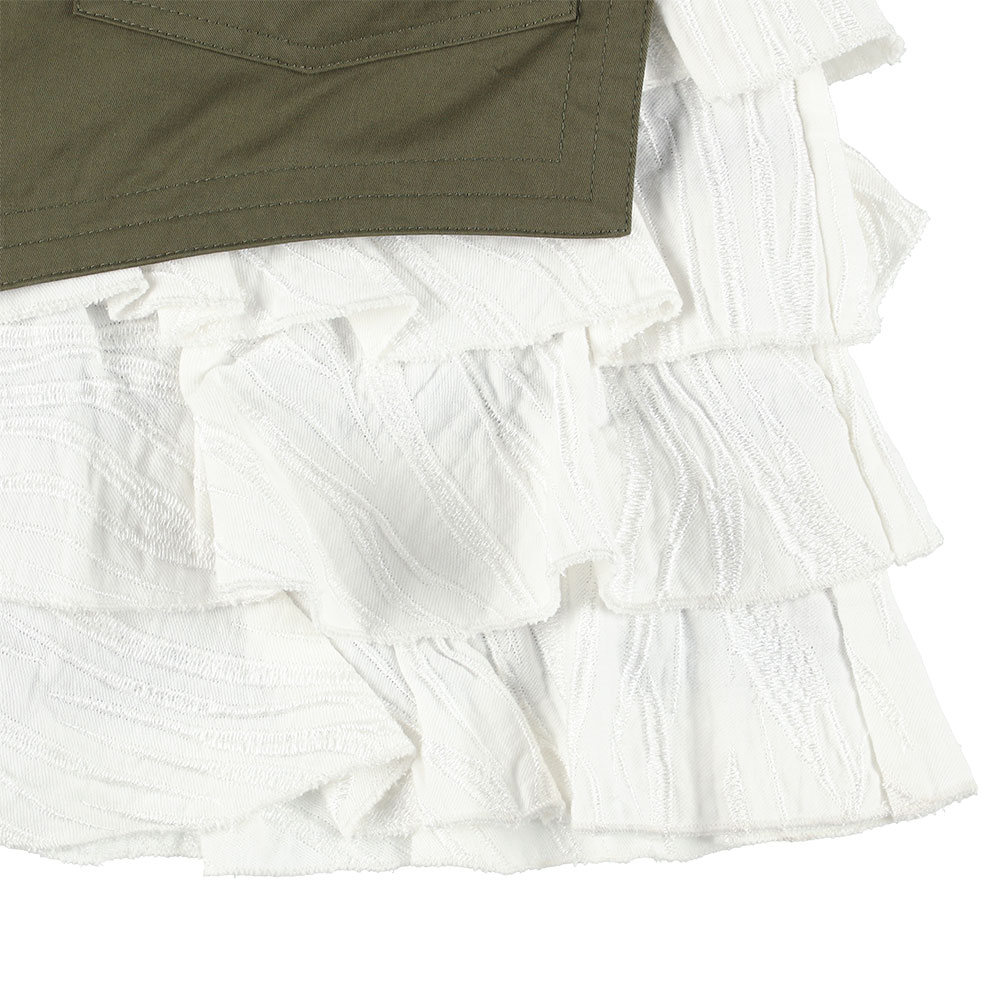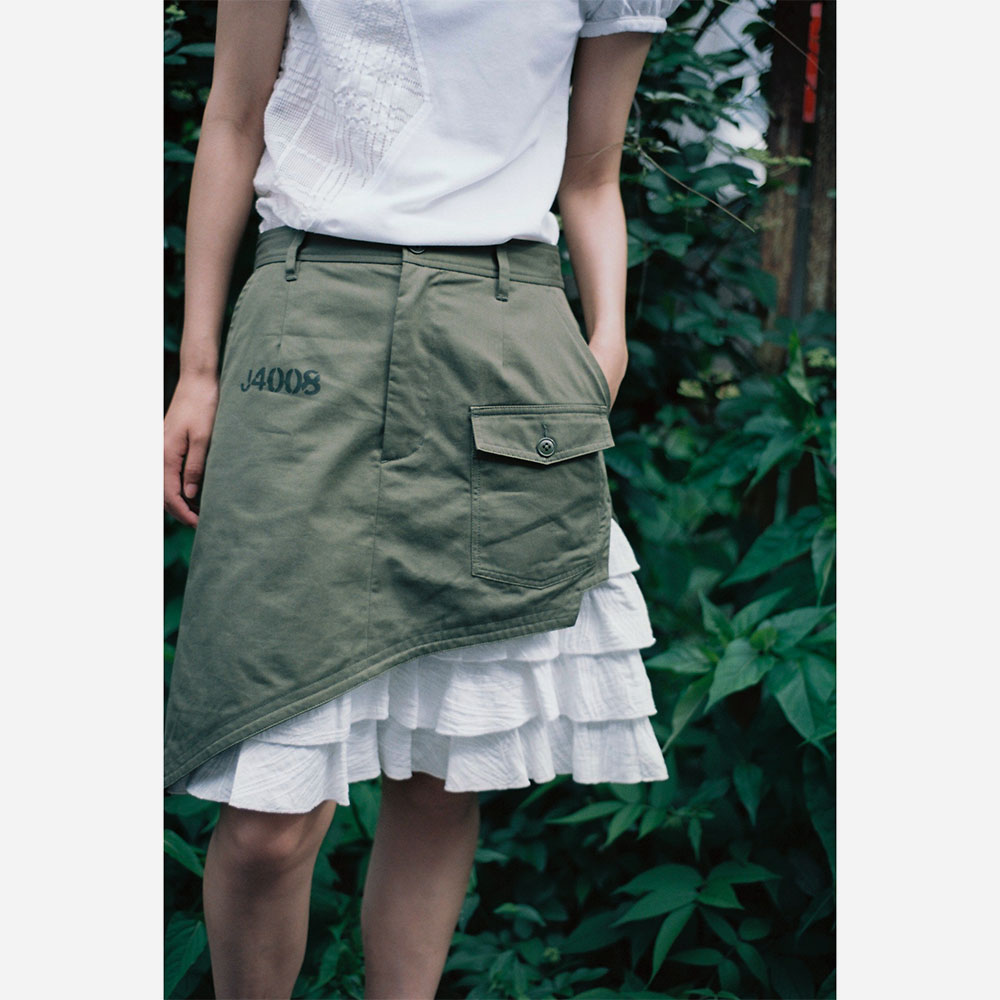 ミリタリーディテールを基調に再構築したアシンメトリースカート。フロントにはフラップ付きカーゴポケット。ウエストからヒップにかけてはすっきりとしたラインで構築されています。裾部分には段状に重ねた立体的なゼブラ柄のフリルをドッキング。オリーブのミリタリー素材と、軽やかなホワイトテキスタイルとのコントラスト◎