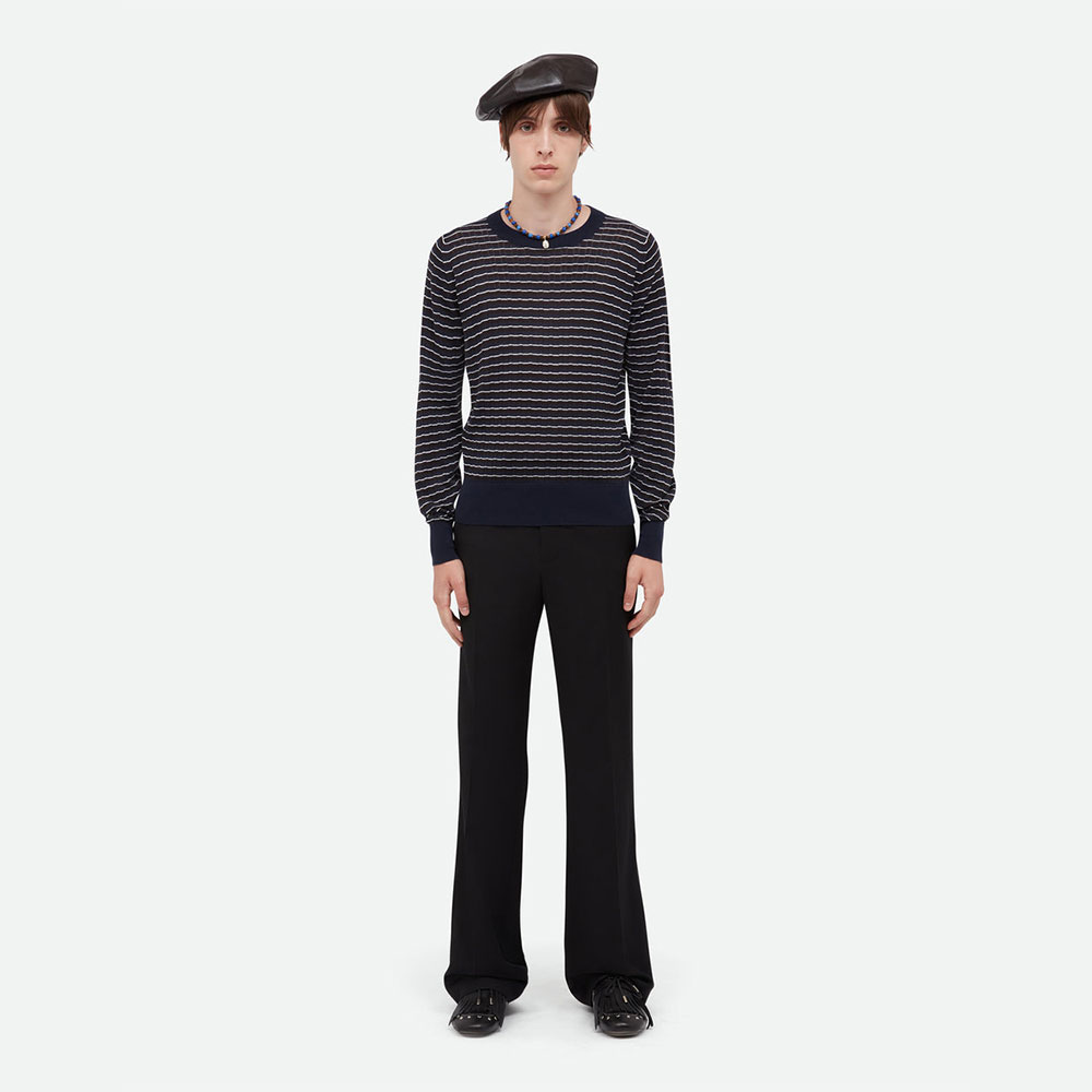 上質なウールを使用したポイントルニットは、繊細な透かし編みが特徴的。ネイビー、ダークブラウン、アイボリーの洗練されたカラーパレットが、品のあるレイヤードスタイルを演出します。