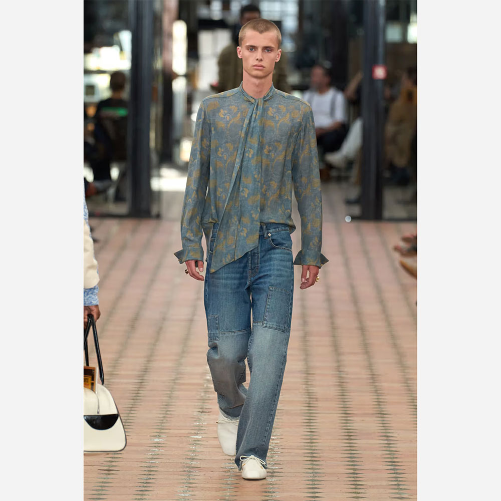 エレガントな佇まいが印象的なボウタイシャツ。今季を象徴するロータス(蓮)モチーフを、インディゴとオリーブのニュアンスカラーで表現しました。リラックス感のあるビスコースリネン素材を使用し、かすかな光沢感と透け感のしなやかな風合いに仕上げています。