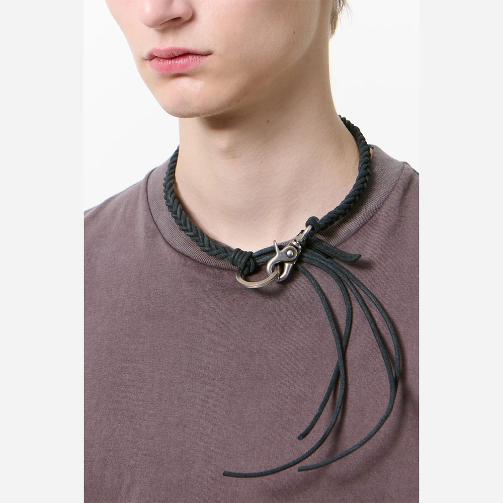 編み込みのレザーコードに、OUR LEGACYの刻印を施した日本製メタルのWリング、手縫いのレザータブを組み合わせています。