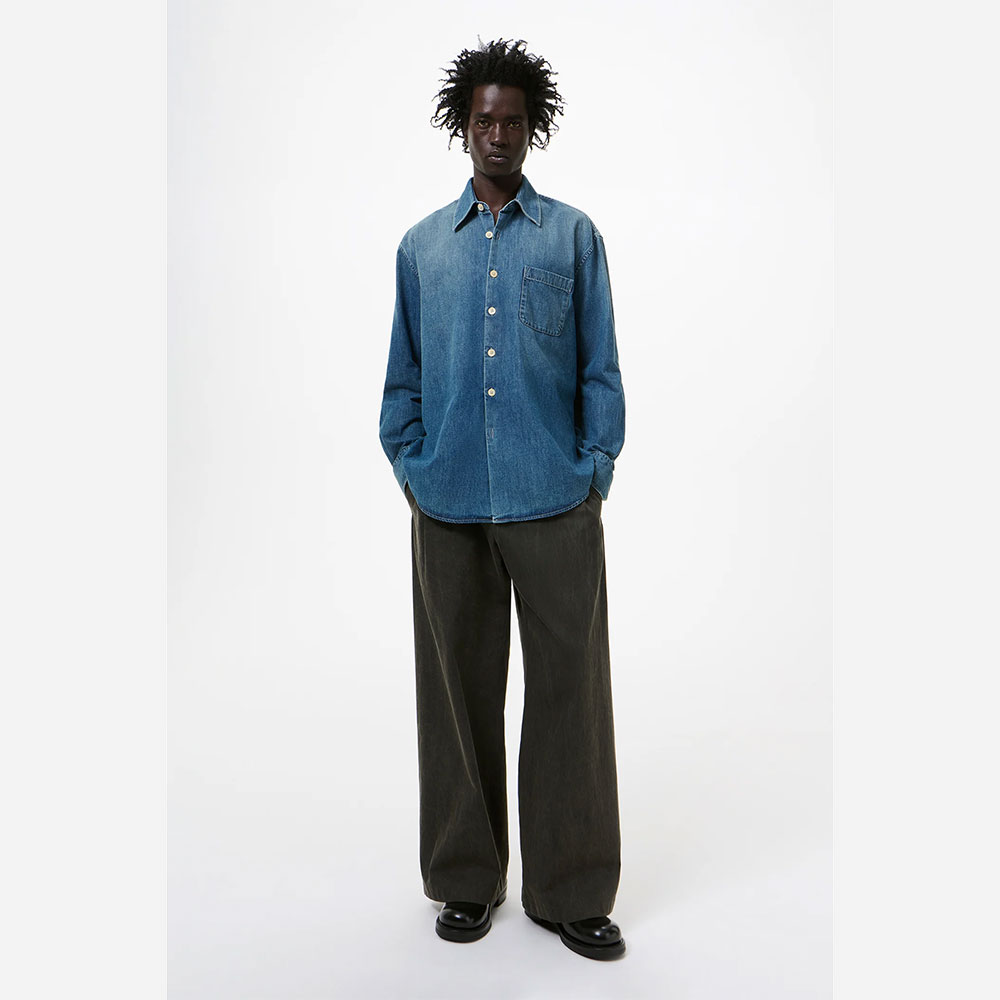 ややオーバーサイズのシルエットで、シングルチェストポケット、真珠貝ボタン、カーブドヘム、マイタードカフスを備えています。