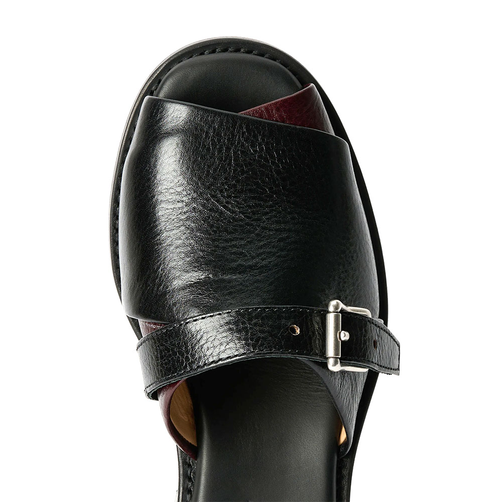 上質なイタリア製ベジタブルタンニン鞣しのフルグレインカウレザーを使用したレザーサンダル。オープントゥのミニマルなシルエットに、コントラストの効いたワイドレザーバンドを2本配置。装飾的なバックルストラップがアクセントを添えます。わずかに傾斜をつけたヒール設計と、レザーソール仕様。さらにグッドイヤーウェルト製法を採用することで、優れた耐久性と安定感のある履き心地を実現しています。