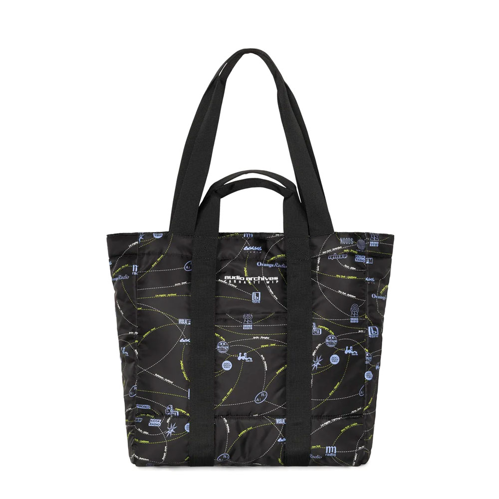 Audio Archives WIP レコードバッグは、裏地付きの中厚ナイロンキャンバスを使用。全面にAudio Archivesのプリントを施しています。