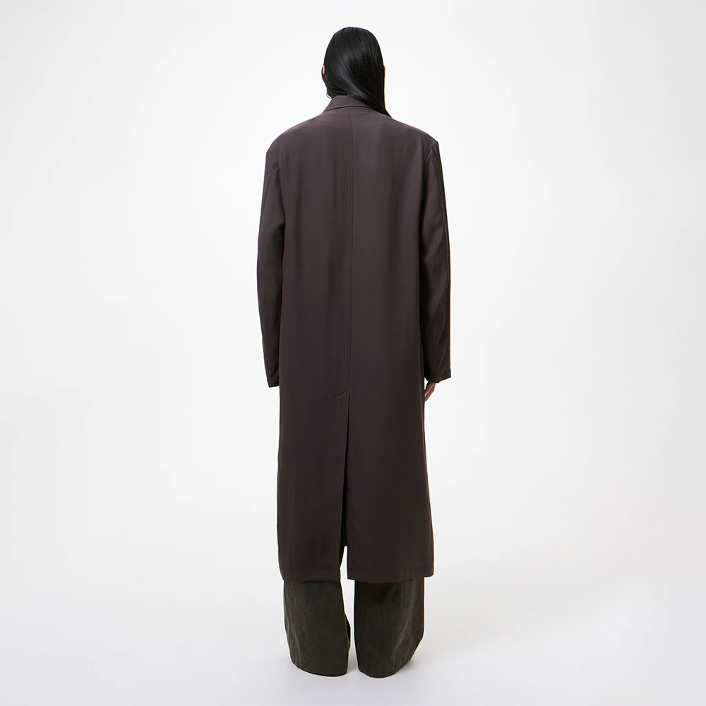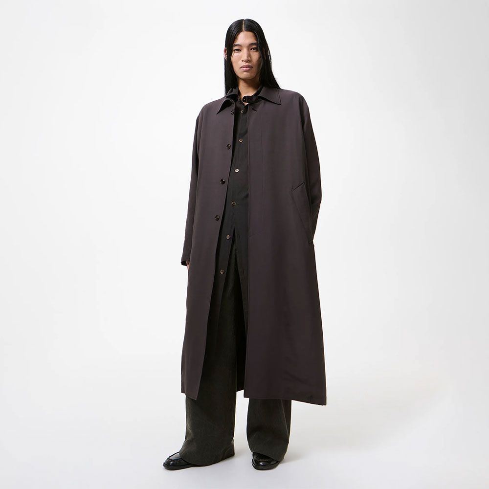 日本製のビスコース素材を使用したスプリングコート。流れるようなドレープと程よいハリ感を併せ持つ生地が、さりげない存在感を放ちます。全体はオーバーサイズかつロングレングスの設計。
