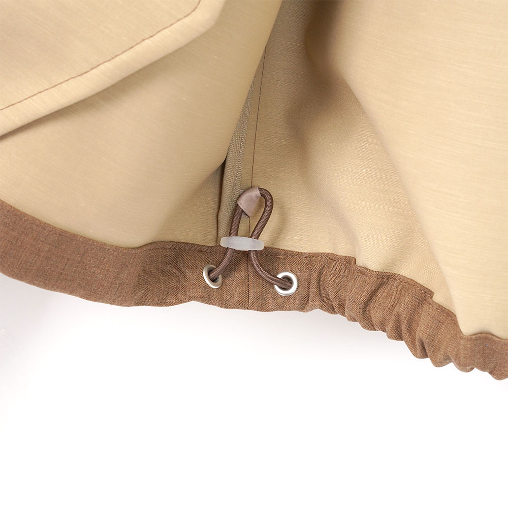 表地にはスーパー130’s梳毛ウールの杢糸のみを使用したウールトロピカルを採用。清涼感のあるさらりとした風合いと滑らかさを兼ね備え、真夏にも適した素材です。裏地にはナイロンの経糸に綿麻の緯糸を高密度に打ち込んだ平織生地を使用。ナイロンの上品な光沢と綿麻のナチュラルな質感が調和し、麻特有のスラブ感も美しく表れています。接着には細かなドット状の樹脂を用いたボンディング加工を施しており、生地本来の風合いを損なうことなく仕立てています。ボンディングならではの程よいハリがシルエットに存在感を与えながらも、厚みを抑えた軽やかで上質な仕上がりが特徴です。