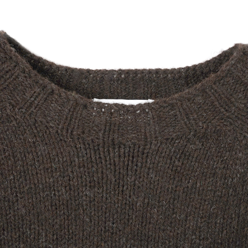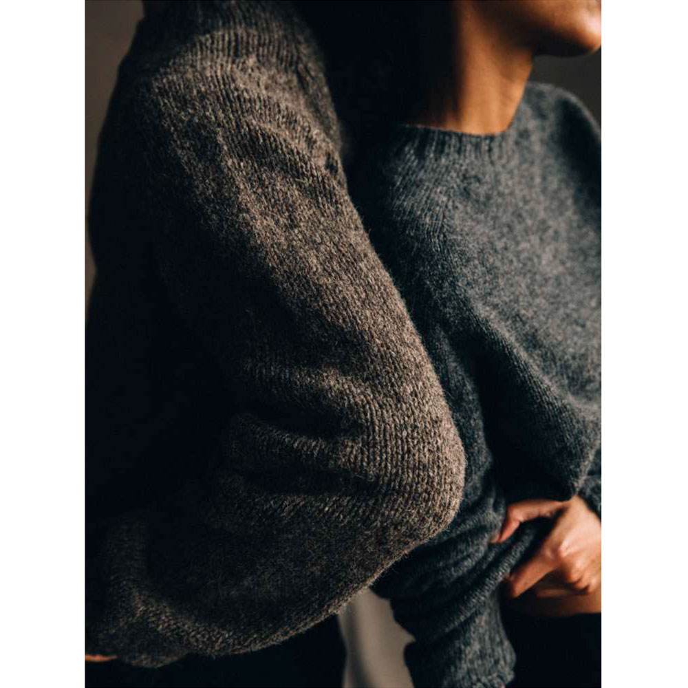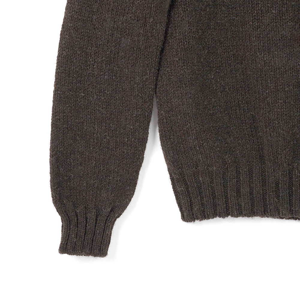 ほどよくゆったりとしたシルエットと、やや肉厚でナチュラルな素材感が魅力のシェットランドセーター。スコットランドで編み立てられ、地元で紡がれた天然の無染色ピートブラウンウールを使用。島の熟練職人による手作業での選別を経て、シェットランドならではの上質な風合いに仕上げられています。丸編みの技法により縫い目のないシームレス構造を実現し、快適な着心地に。編み機から一着の状態で仕上がるため、環境負荷の少ないゼロウェイスト製法も特徴です。