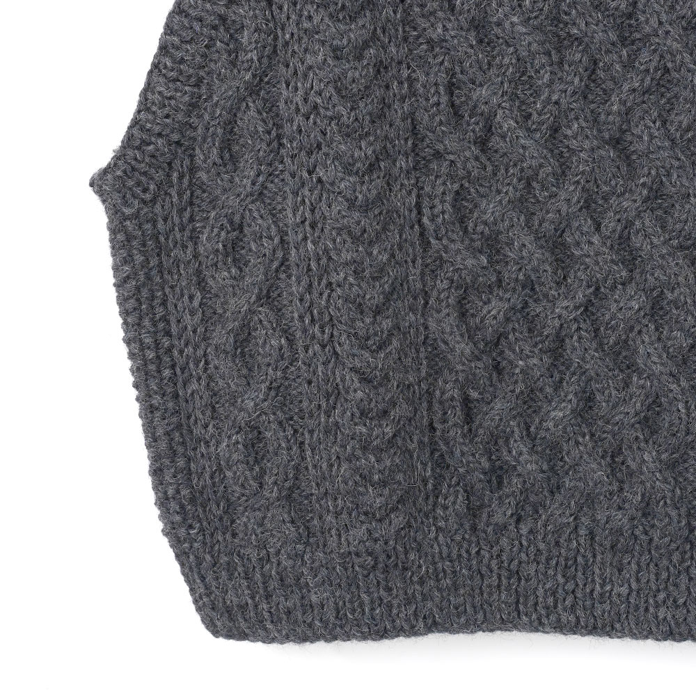 クラシックなケーブル編みが特徴のアランベスト。伝統的なアランウールを使用し、職人の手によって丁寧に編み上げられています。