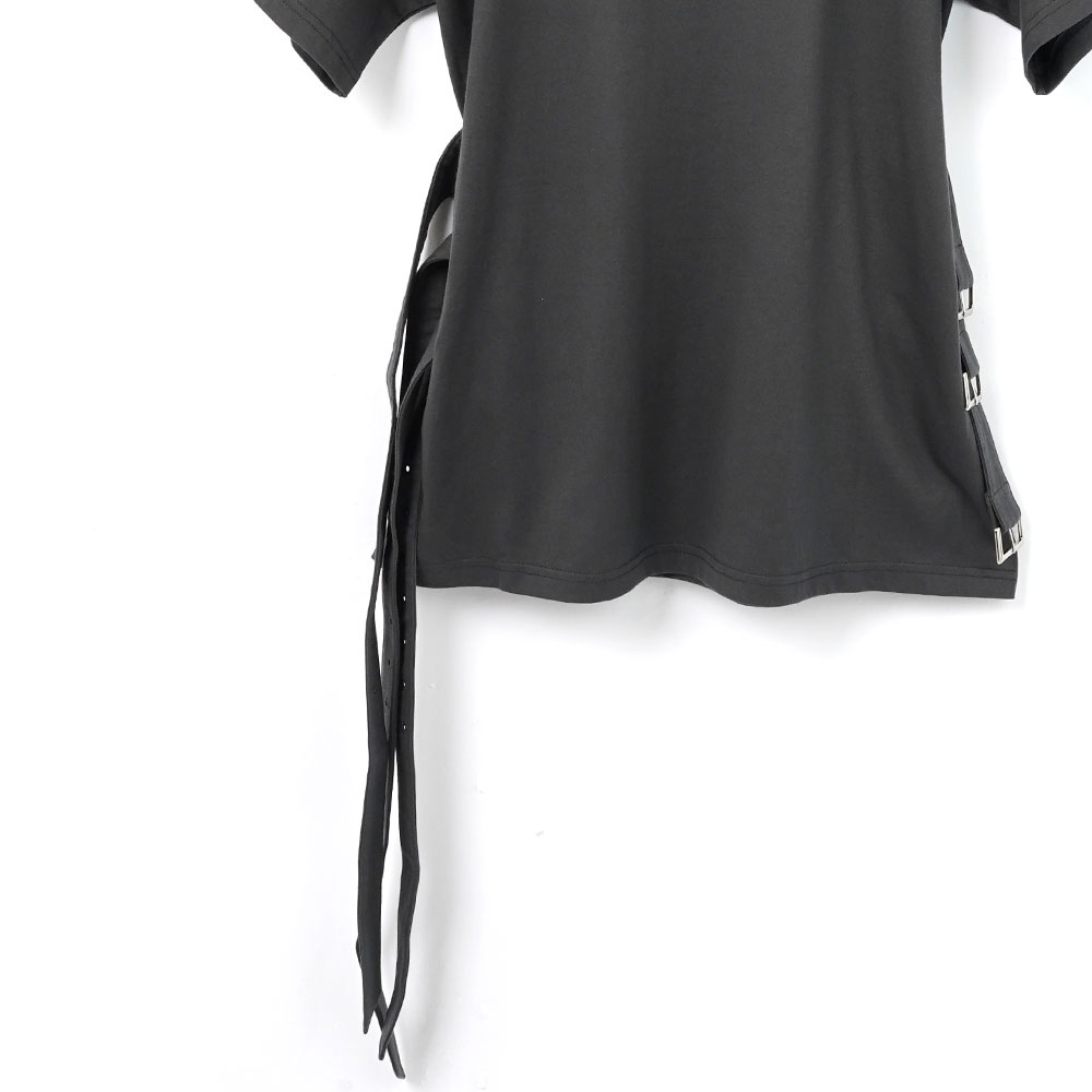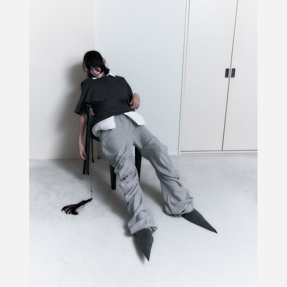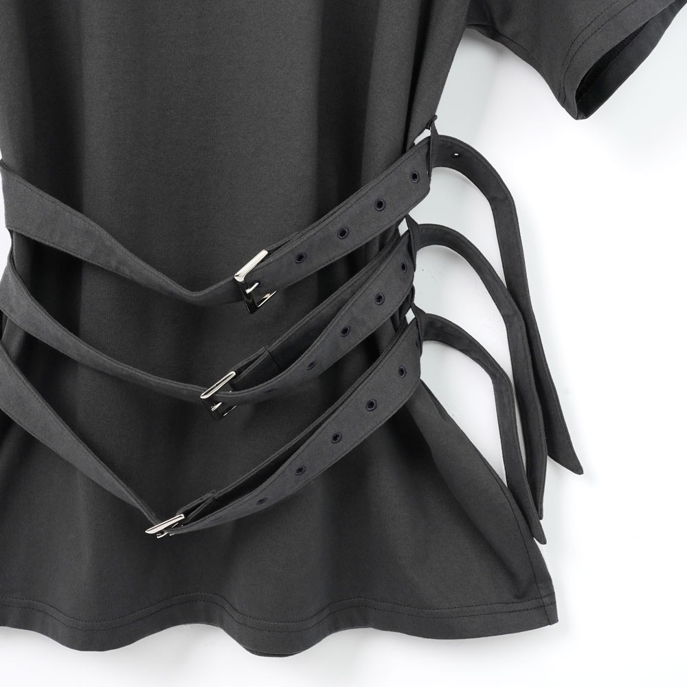 オーバーサイズのゆったりとしたボディに、コルセットのようなディテールを重ねることで、解放と制御のアンバランスさを表現した一枚。