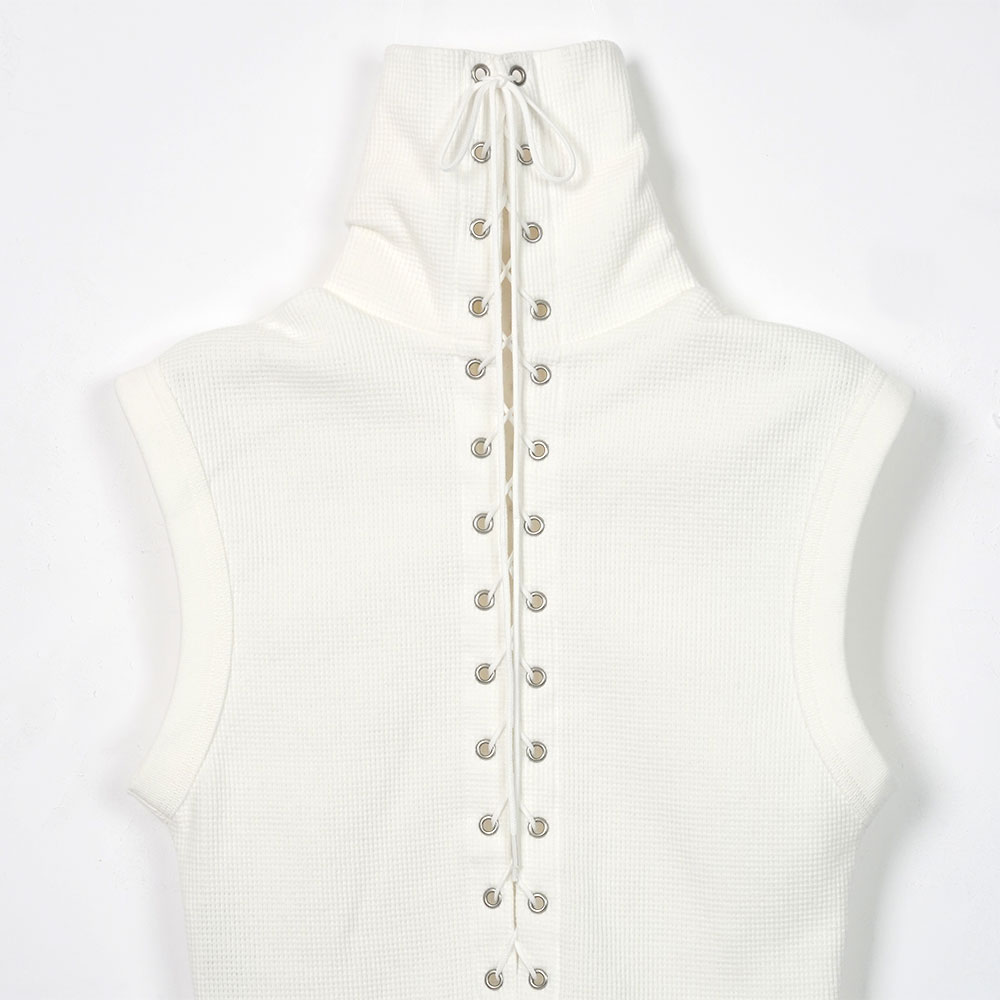 高めに設定された襟や、前後に密に配置されたボタンやハトメが、ブランドらしい緊張感のあるムードを演出します。