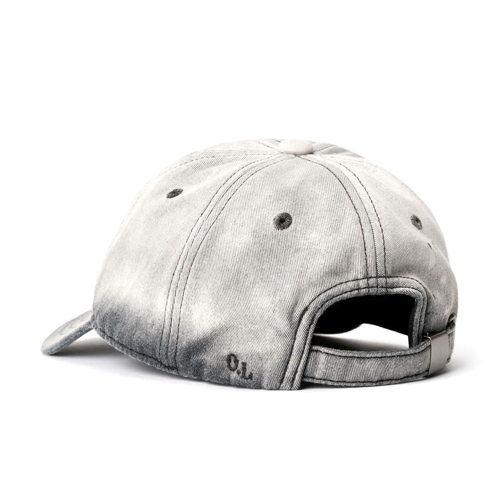 ステッチ入りアイレットやOLロゴ刺繍を配し、後頭部にはストラップによるサイズ調整機能を搭載。真鍮製の金具を使用し、さりげないアクセントを加えています。
