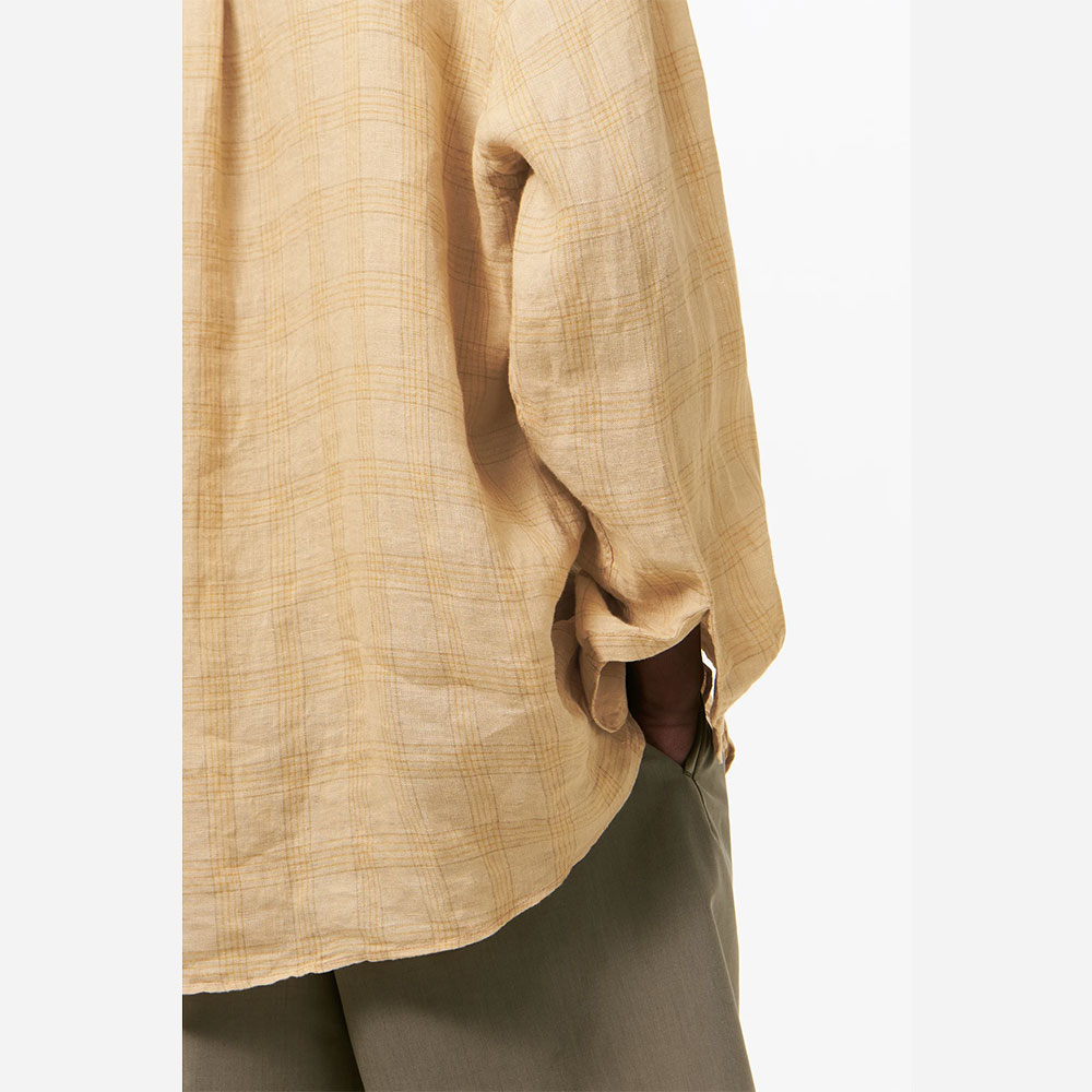 ヴァケイチェック柄のガーゼリネン素材を使用したロングスリーブシャツ。イタリア製のコットン/リネン/ポリエステルをブレンドした生地は、軽やかで通気性が高く、ふんわりとしたエアリーな着心地が魅力。織りで表現されたさりげないチェック柄が、上品な雰囲気を演出します。シルエットは程よくゆとりを持たせたリラックスフィット。胸元にはシンプルなパッチポケットを配し、ボタンにはナチュラルな風合いのコロゾボタンを採用しています。袖口はミタードカフス仕様、裾は緩やかなカーブを描くラウンドヘムで、細部まで丁寧に仕上げられています。