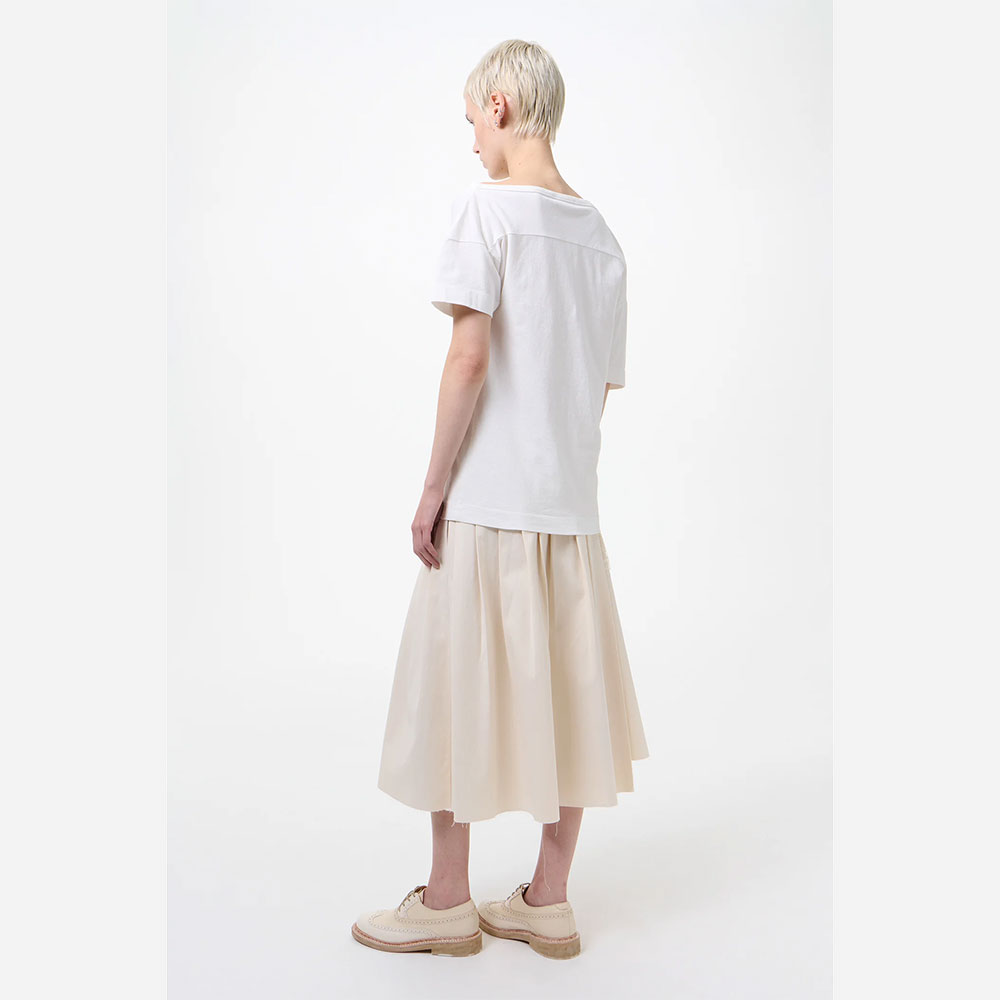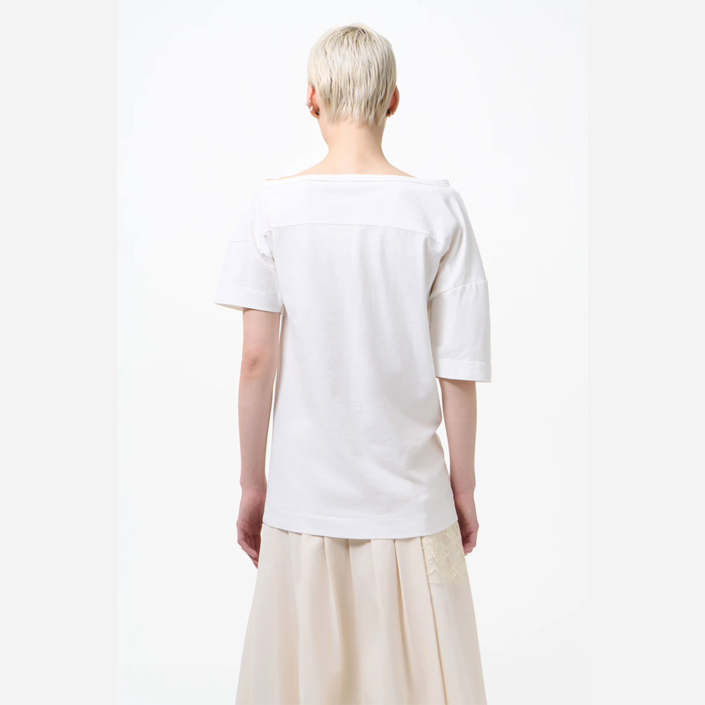 左肩を落としたアシンメトリーなスリーブや、バックヨークがさりげないアクセントになっています。