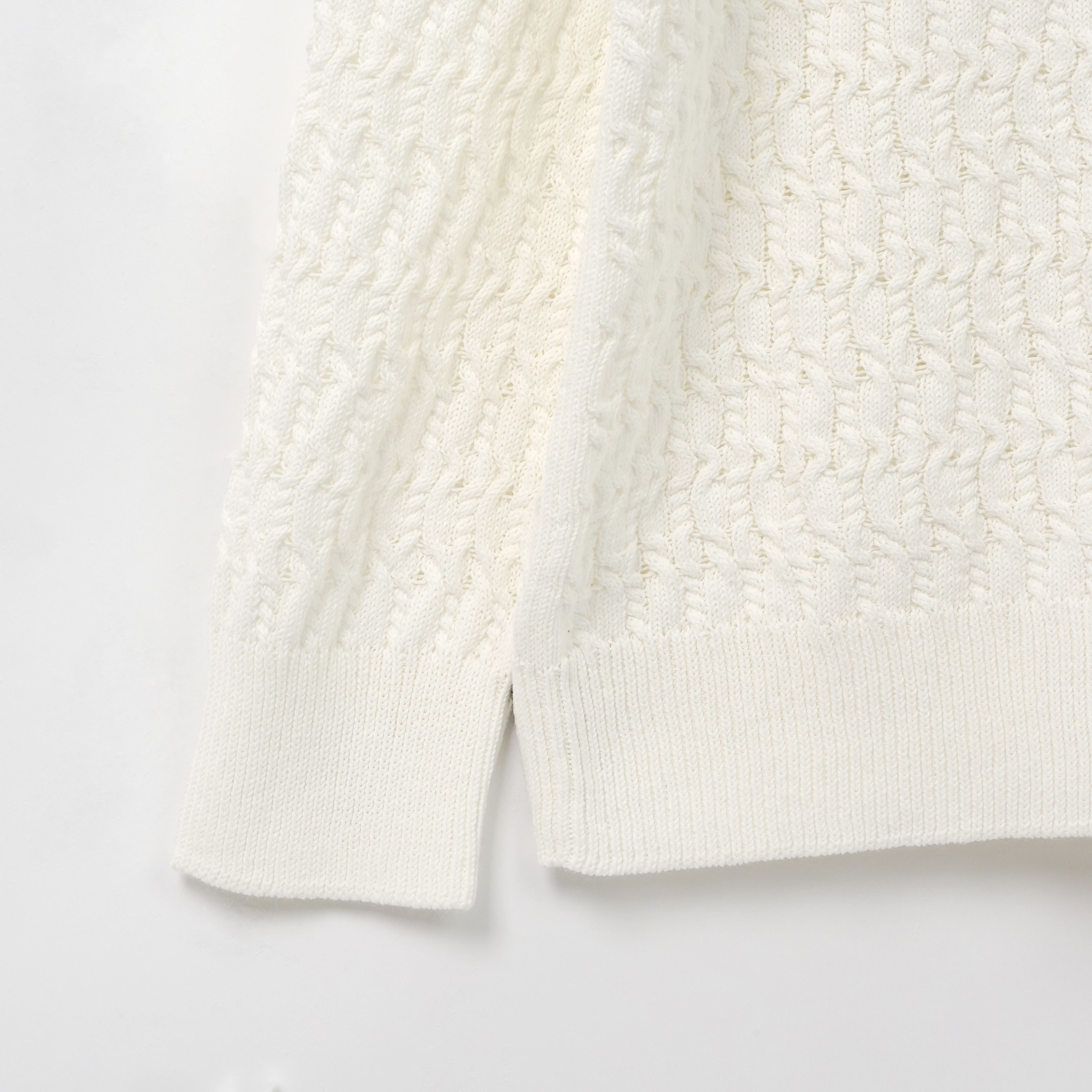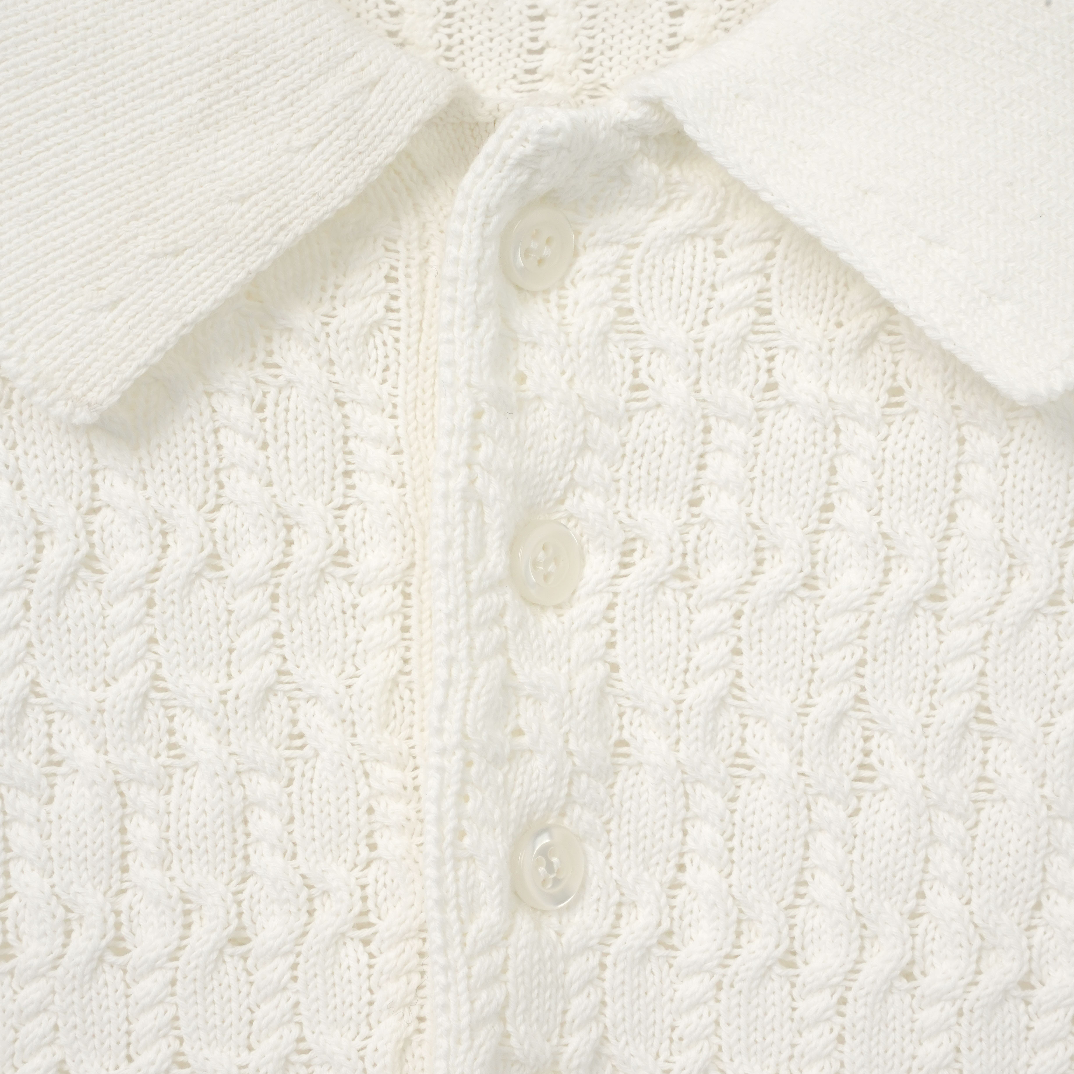 イタリアで編み立てられた上質なコットン100%の糸を使用したケーブルニットポロ。全体に施された立体感のあるケーブル編みが、シンプルながらも豊かな表情を演出します。クラシカルなレギュラーフィットで、着丈はやや短めでバランスの良い設計。上品さと日常使いのしやすさを兼ね備えた一着です。