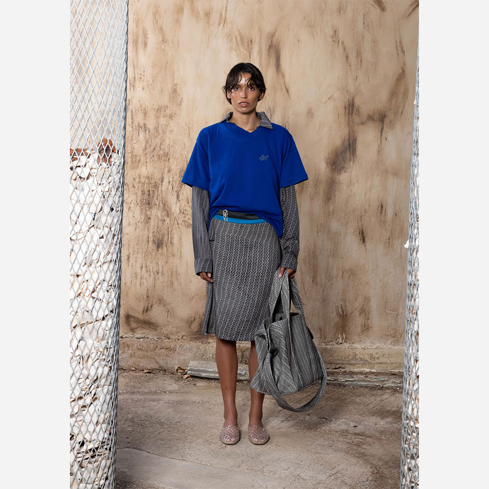 ネックラインにウエストバンドディテールを配した、ユニークなデザインのTシャツ。コーディネートに映える、鮮やかなブルーが印象的な一着。