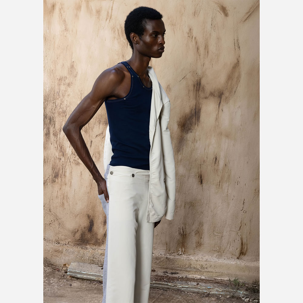 ネイビーのような深みのあるマリンブルーのタンクトップ。ネックラインに沿ってブランド名入りのリベットを施したデザインが特徴です。コントラストの効いたステッチがデザインを引き立てています。