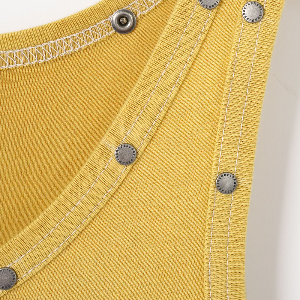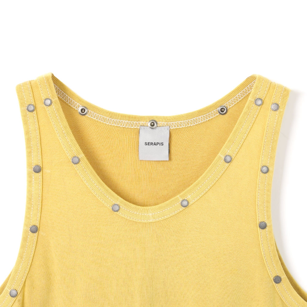 マスタードイエローのような深みのある色合いが魅力のタンクトップ。ネックラインに沿ってブランド名入りのリベットを施したデザインが特徴です。コントラストの効いたステッチがデザインを引き立てています。