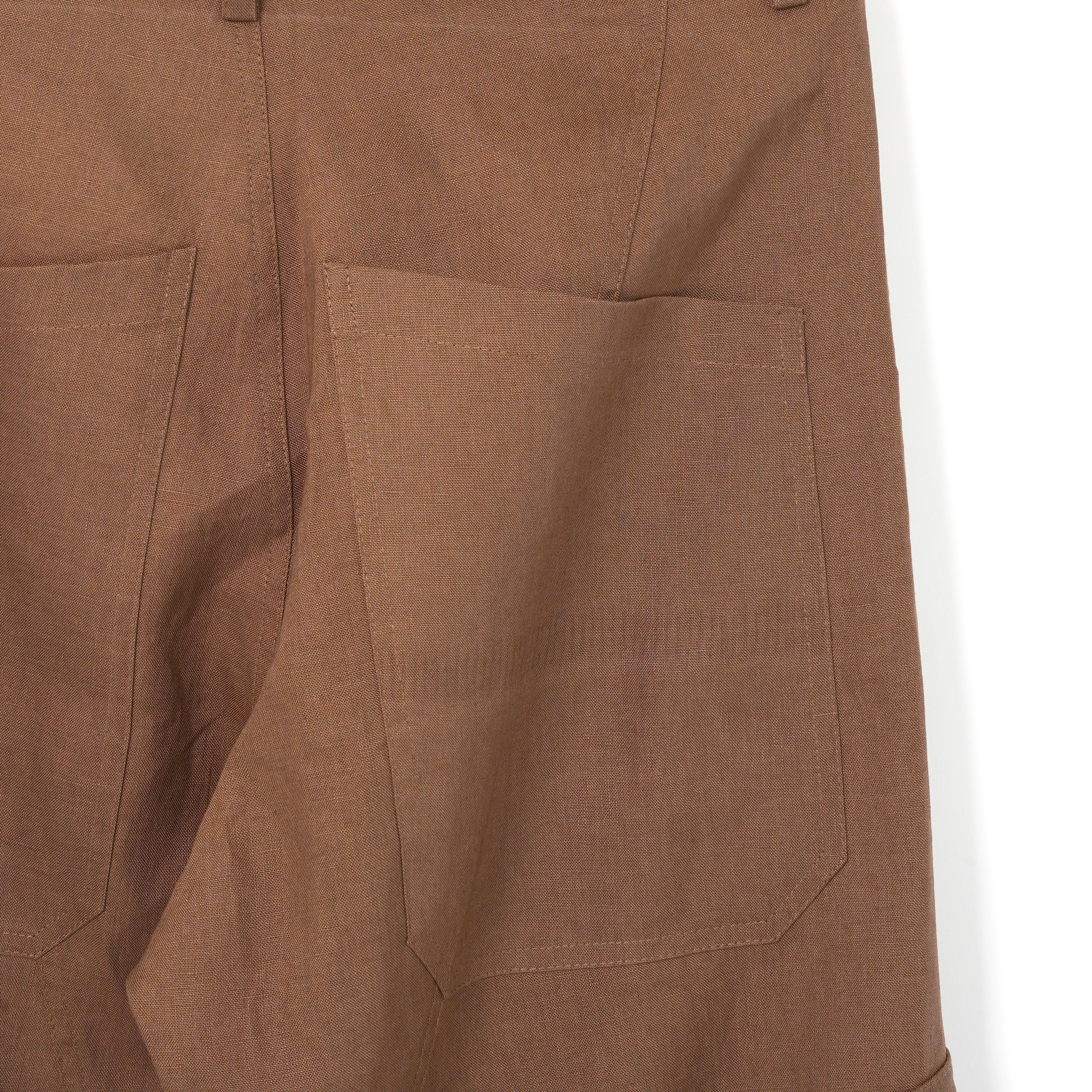 ハリと艶のあるリネン素材を使用したカーゴパンツ。斜めに配置されたカーゴポケットやヒップポケットのフォルムが特徴的な一着です。ブランド名が刻印されたリベットが施され、さりげないアクセントに。ミッドライズ、ワイドフィットのシルエットです。