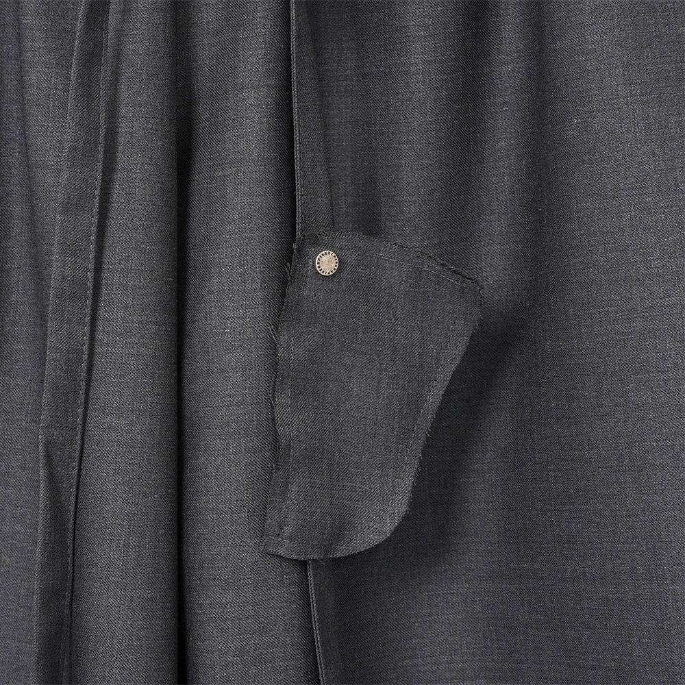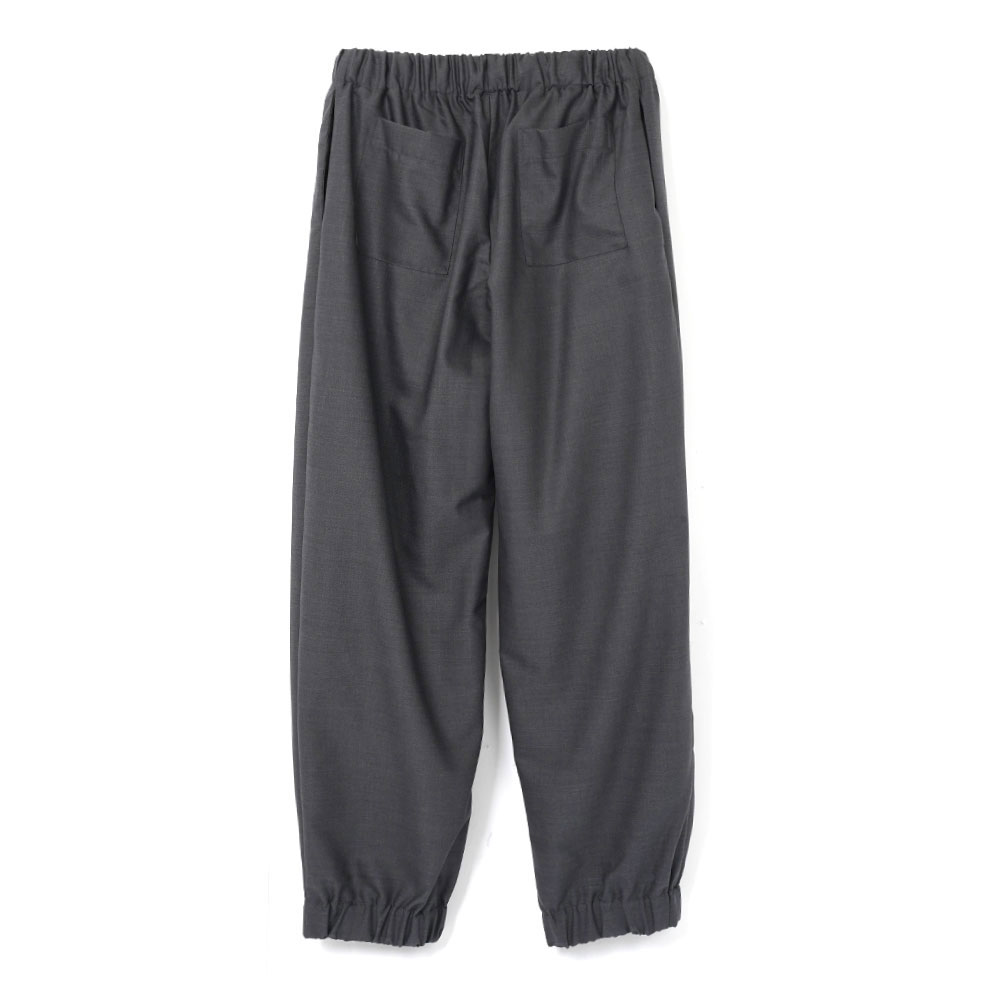 ダークグレーのウール混紡生地を使用した、ドレープ感が美しいイージーパンツ。ウエストはゴム仕様に加え、アクセントとして取り外し可能なアクセサリー付きのドローストリングを配しています。両サイドにポケット、背面にはパッチポケットを2つ備えています。スウェットパンツのようなカジュアルなシルエットながら、素材感により上品さも感じられる一着です。