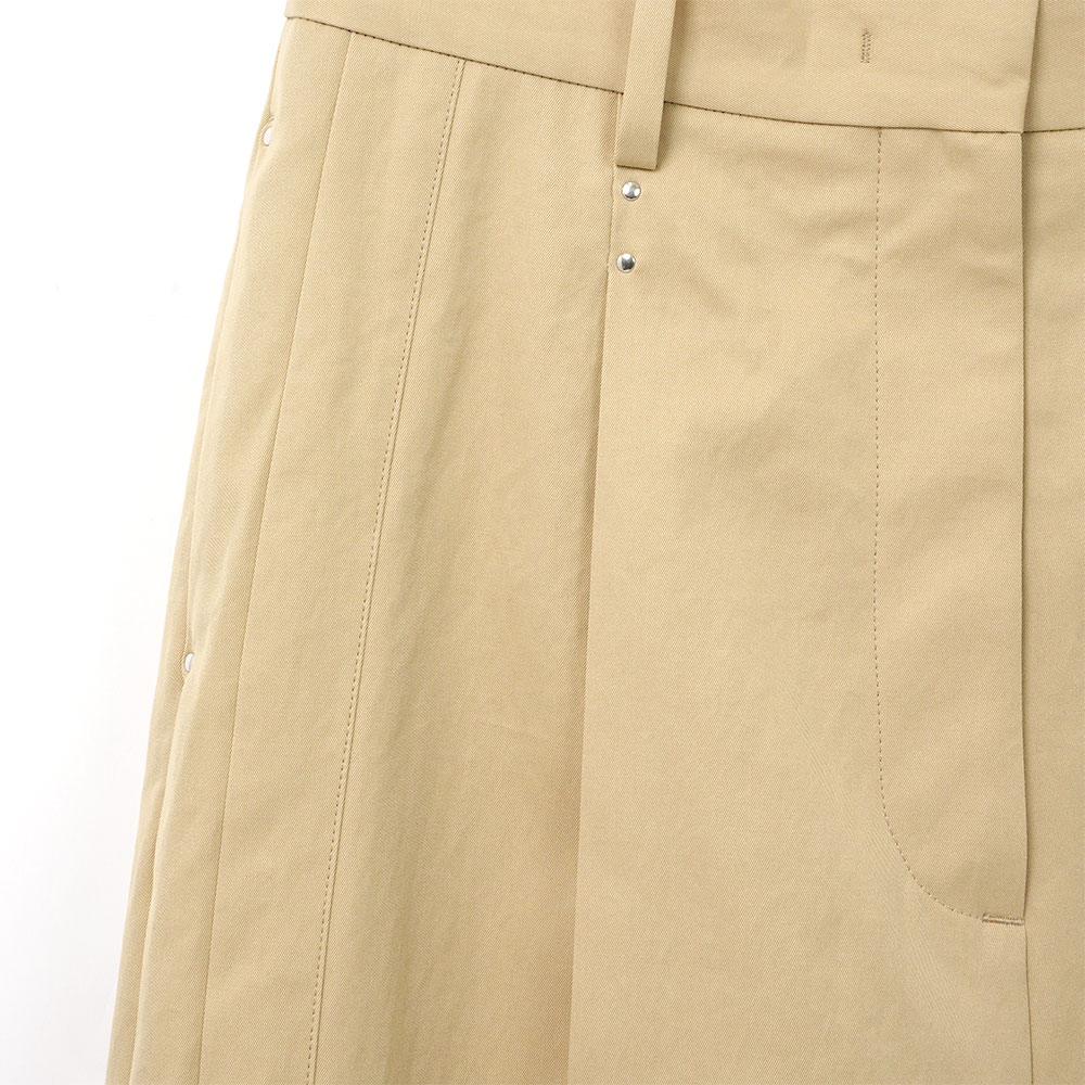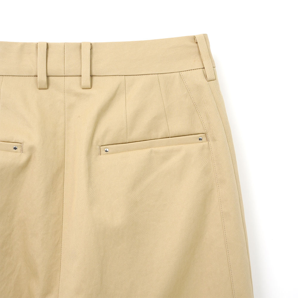 両脇のタキシードディテール(側章)がクラシックさを演出するワンタックテーラードショーツ。タックやポケット⼝のカシメがさりげないポイントに。