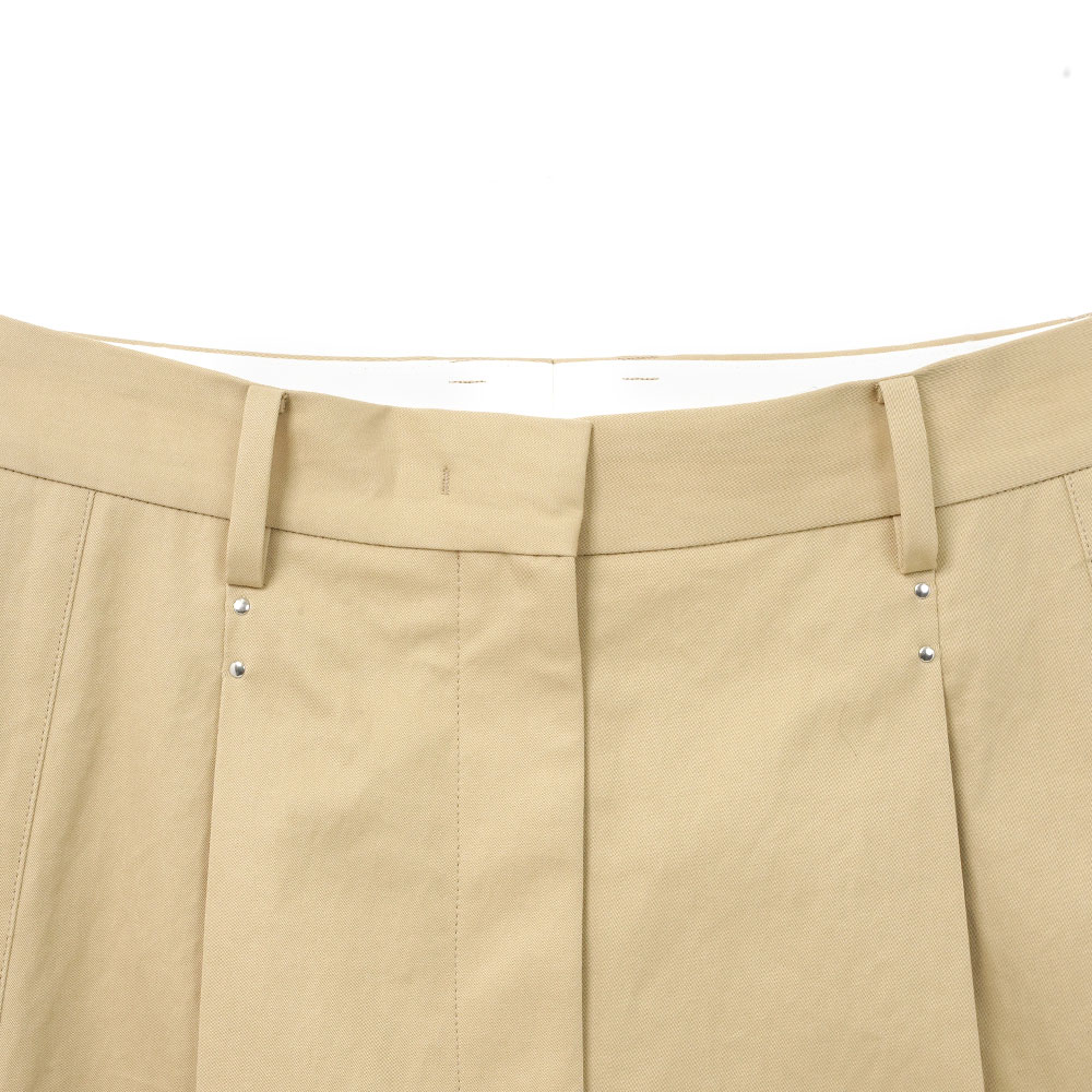 両脇のタキシードディテール(側章)がクラシックさを演出するワンタックテーラードショーツ。タックやポケット⼝のカシメがさりげないポイントに。