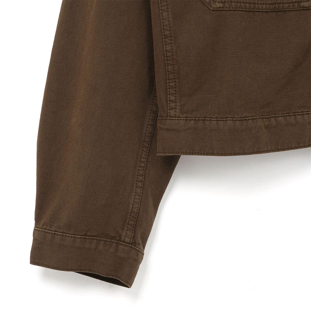 着用時に丸みを帯びる幅広のスリーブと、ボクシーでクロップドなシルエットが特徴。ナチュラルな雰囲気のカカオカラーも魅力です。