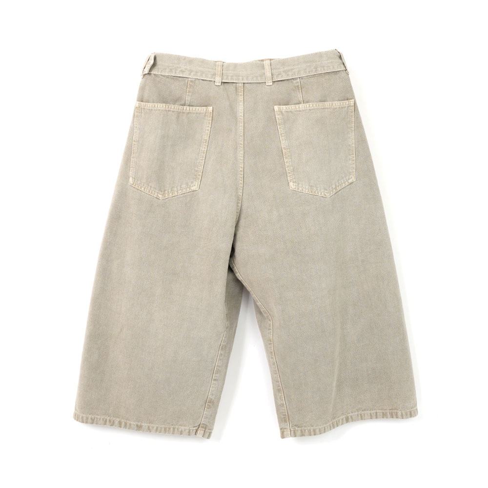 ゆったりとしたシルエットが特徴のワイドカットのバミューダショートパンツ。厚手のブロークンツイルにスノー加工を施し、霜が降りたような風合いに仕上げています。ブランドらしくモダンで洗練された印象の1本。