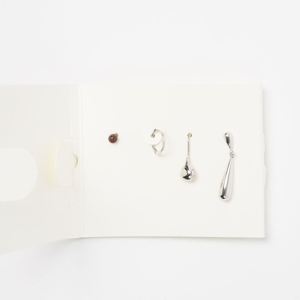 ルメールジュエリーシリーズのユニセックスピアス4点セット。半分が空洞になったペンダントピアス、小さなフープピアス、エナメルのピンピアス。4種類のセット。