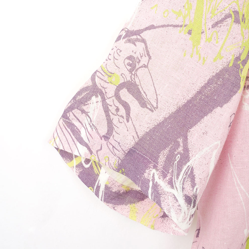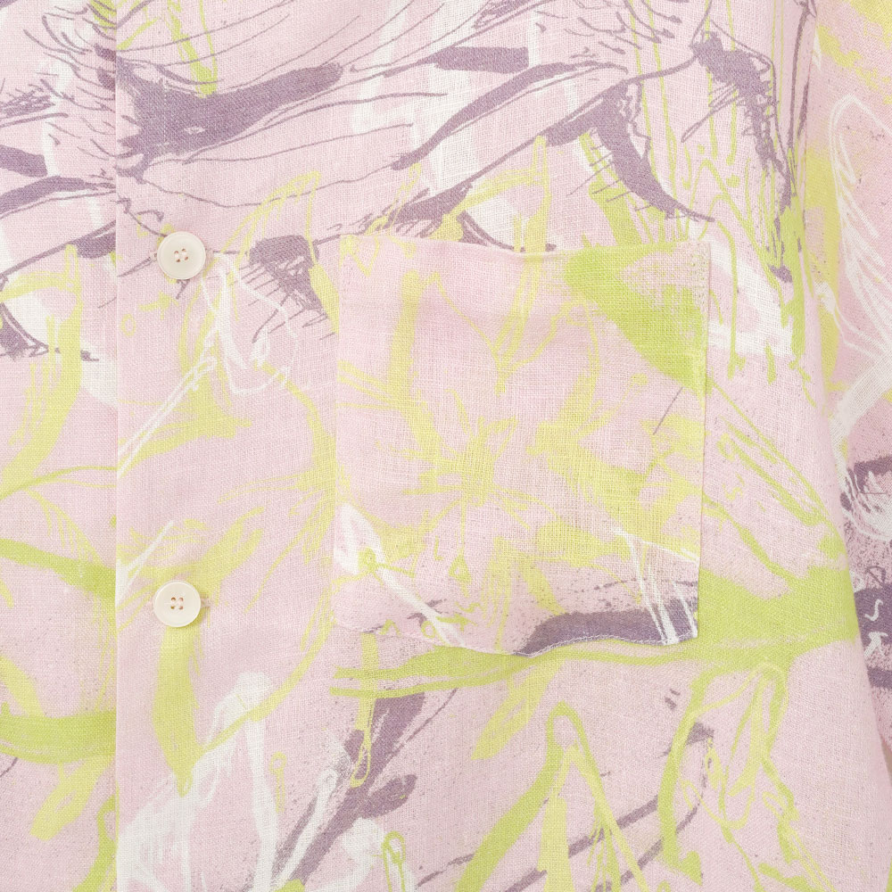 鳥や花をモチーフにしたアブストラクトなペイントを全体にプリントし、存在感のある仕上がりのショートスリーブシャツ。ゆとりのあるボクシーシルエットで、快適にご着用いただけます。涼しげなリネン素材を使用し、リゾート感漂う一着です。