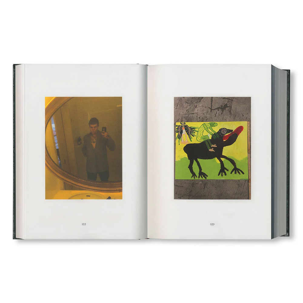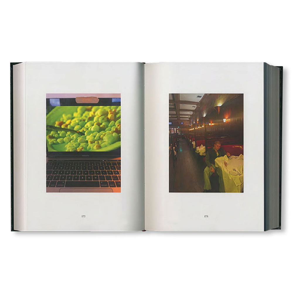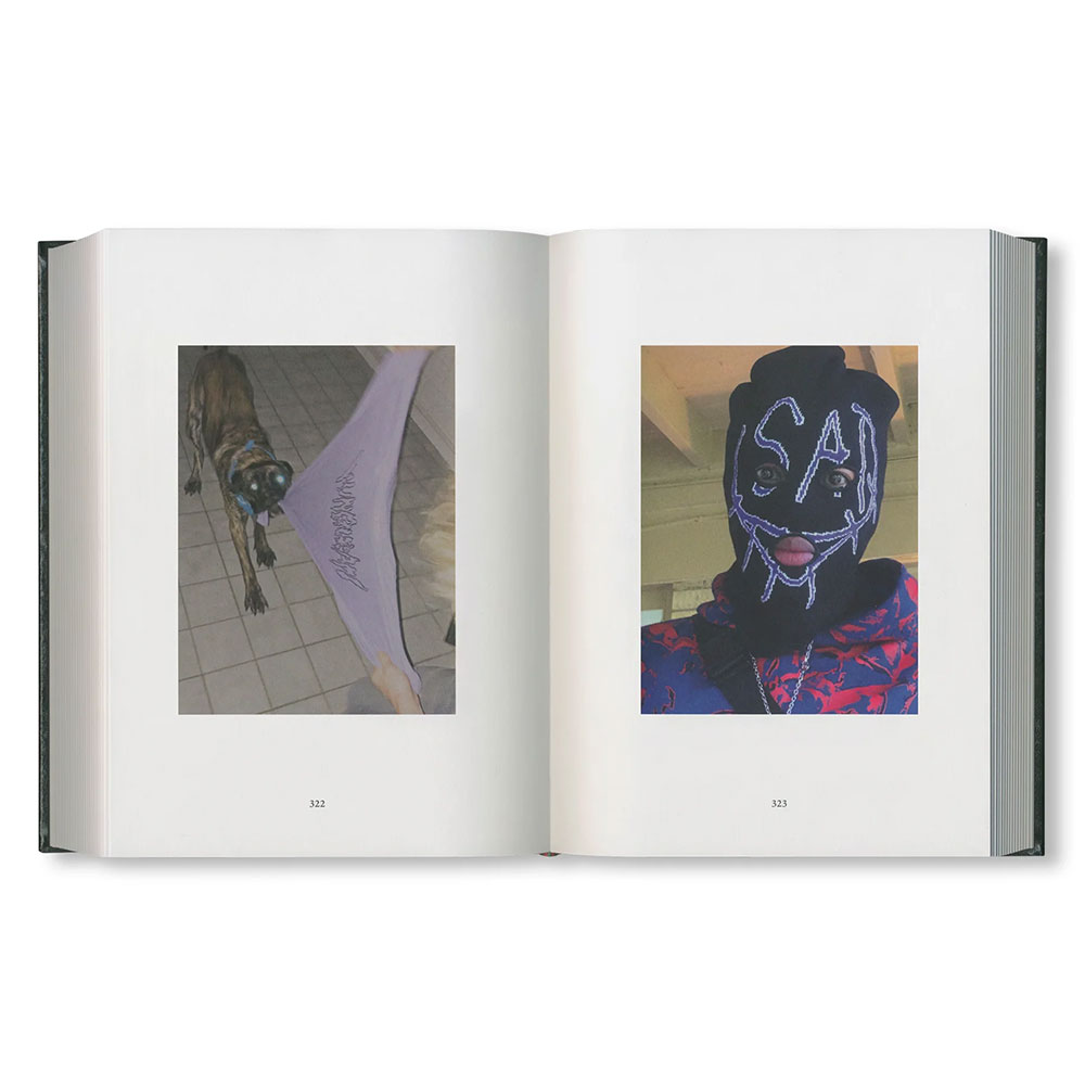 iPhone 6、8、X、SEで撮影された574枚の画像を収録した本作は、作者の自発的かつ積極的な芸術制作の姿勢を象徴していると言えよう。スマートフォンの個人的なフォトライブラリーに保存された親密で即興的なイメージ群が、古典的な本の形に再構成されている。イタリアで制作された本書に用いられている素材は、カーヴァ・デ・ティッレーニの街にある製本会社「Legatoria Industriale Artigianale」で500年続く聖書製本の伝統技術によって生かされている。赤い箔押しのタイポグラフィがメランジ状のグリーンの表紙を飾り、背には赤いシルクのリボンが栞としてあしらわれ、美しさの共鳴をさらに高めている。そのような古典が持つ強さや耐久性を挑発するように、拡散して「バズる」エフェメラのしるしとして、銀色にぎらつくステッカーのシートが付属している。