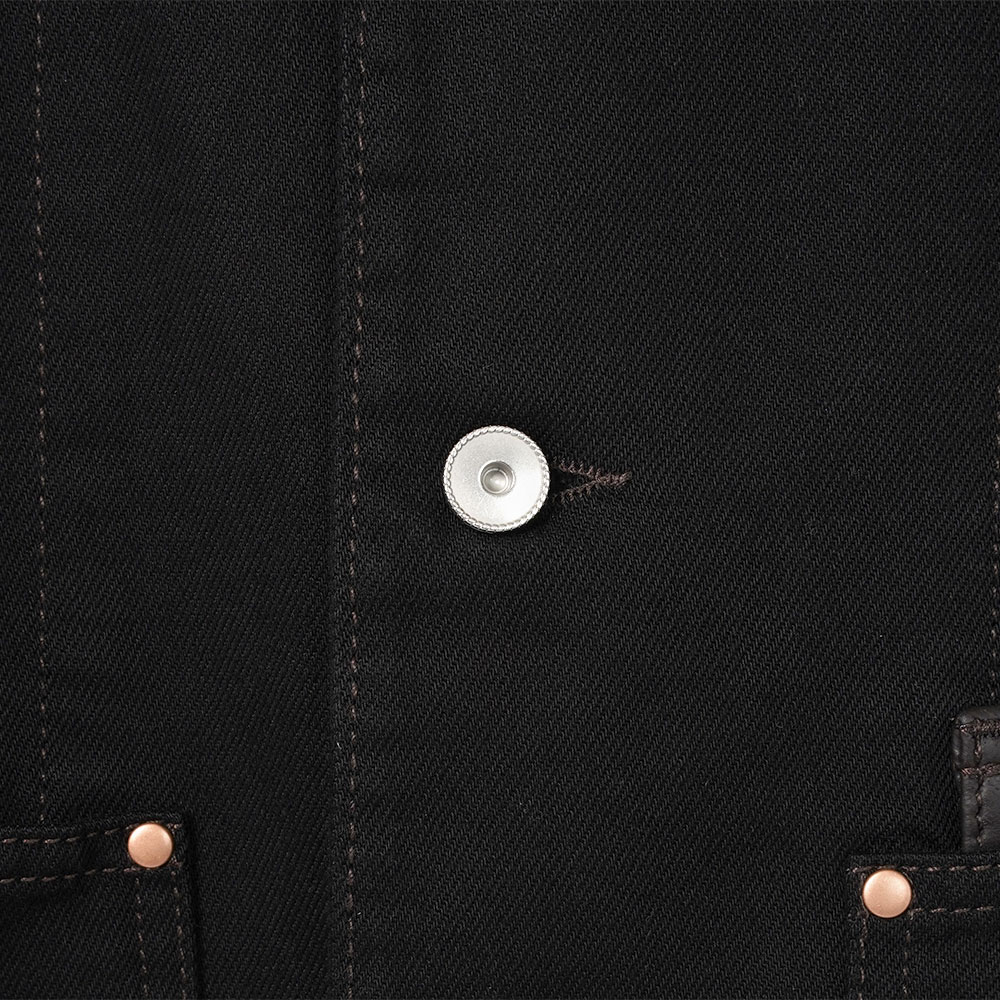 中厚のブラックデニムを使用し、無骨なワークウェアの要素をベースにしながらも、ブランド特有のクリーンなラインで洗練された印象に仕上げられています。