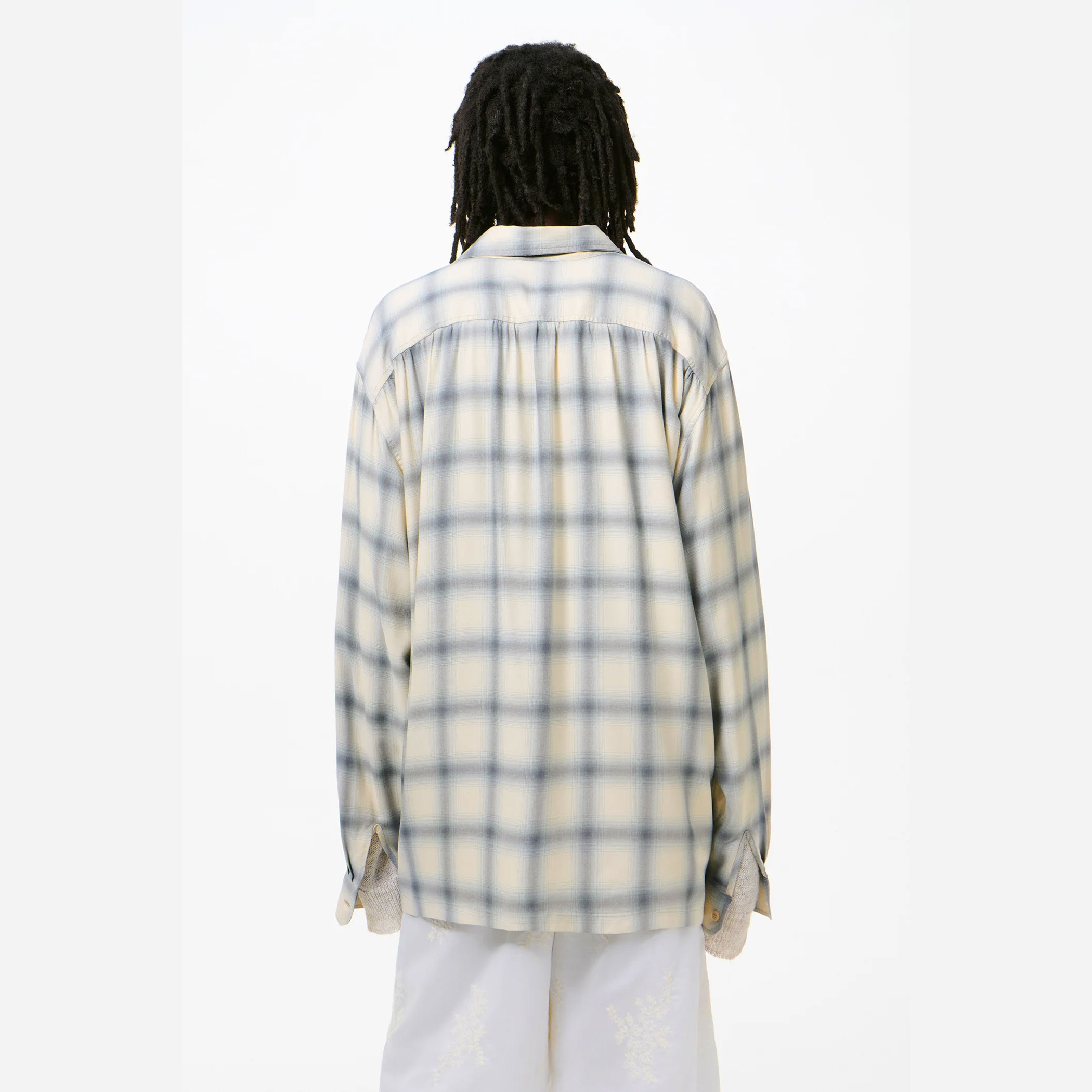 ゆったりとしたシルエットがリラックス感のある着心地を実現しながら、洗練された印象を演出。ストレートヘムにより全体をすっきりとまとめ、幅広の衿当てを施した前立てがクリーンな表情を引き立てます。さらに、真珠貝のボタンがさりげない高級感を添え、背面のヨーク部分に施された控えめなギャザーが自然な動きと立体感を生み出しています。